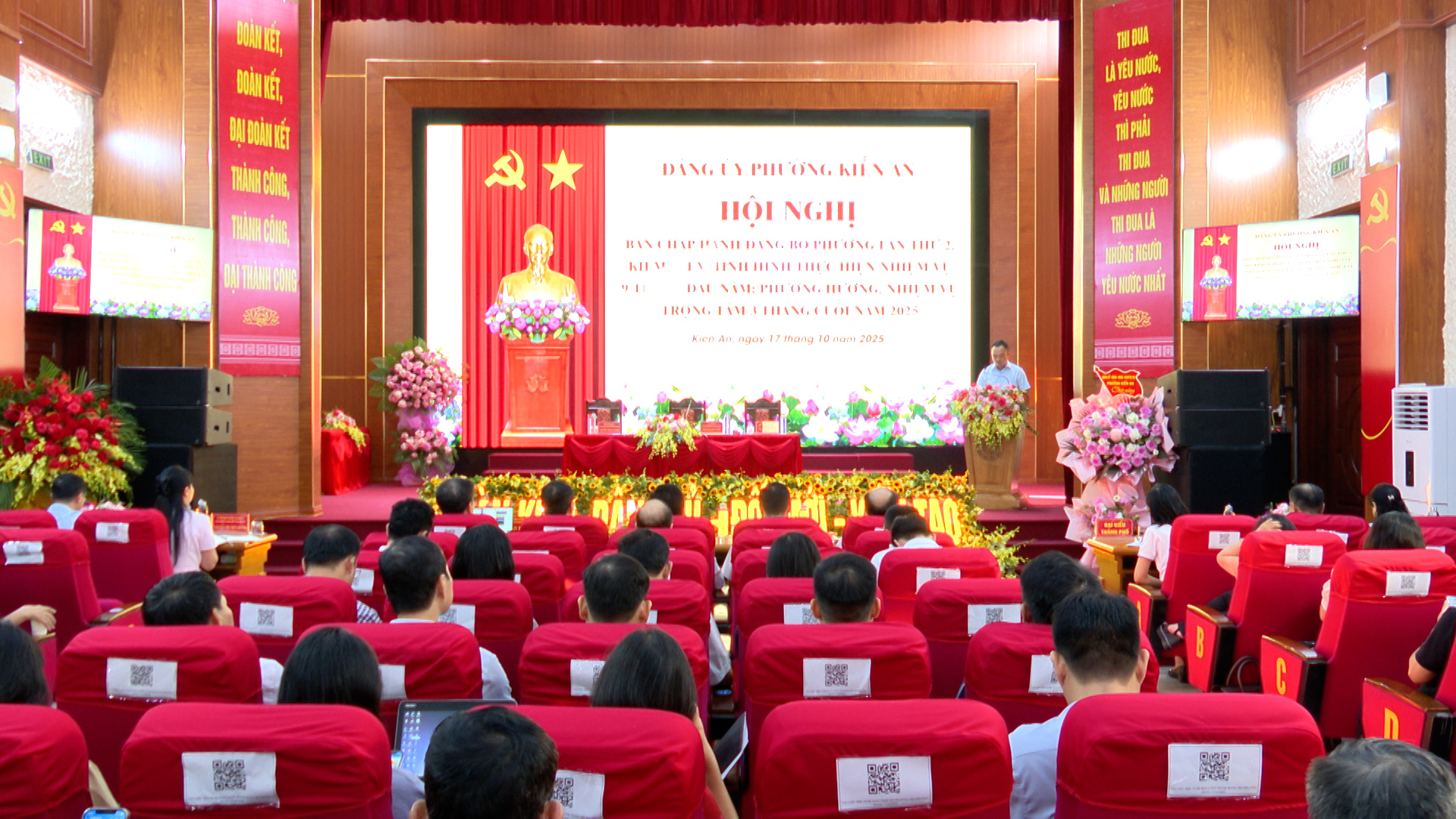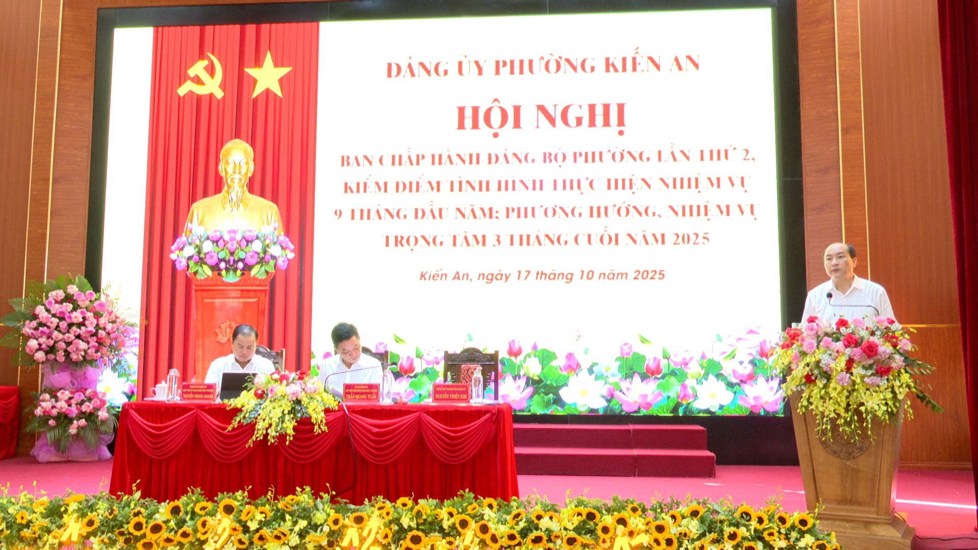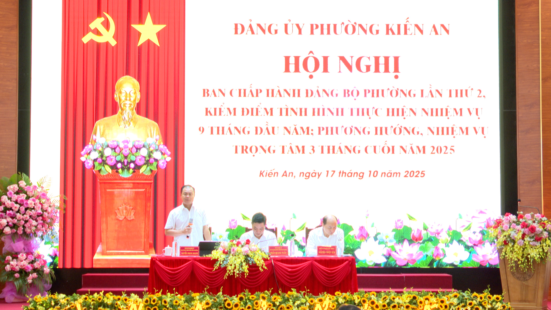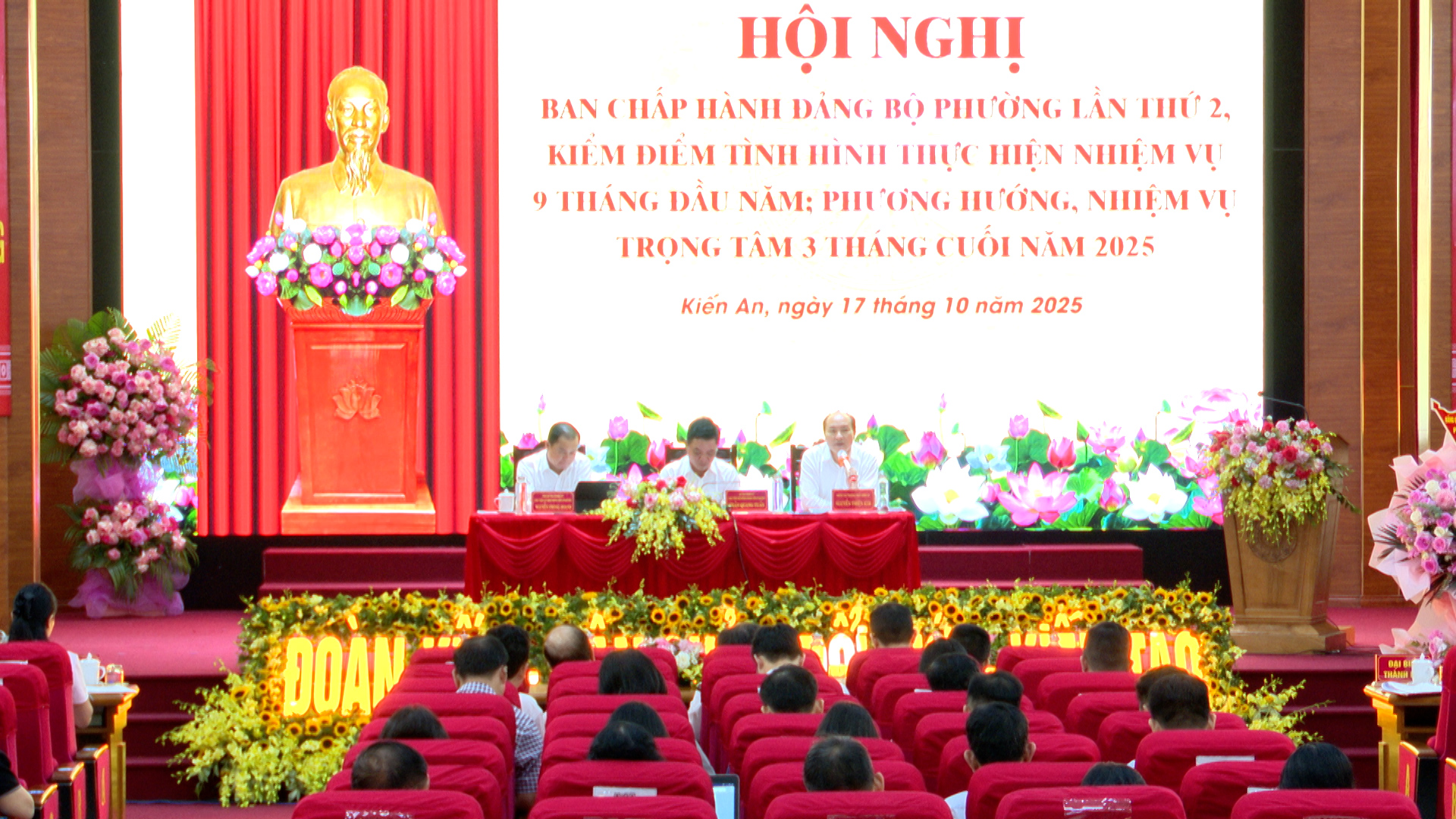 Sáng ngày 17/10/2025, tại hội trường Đảng uỷ phường diễn ra Hội nghị Ban Chấp hành Đảng bộ phường lần thứ 2, kiểm điểm tình hình thực hiện nhiệm vụ 9 tháng đầu năm; phương hướng, nhiệm vụ trọng tâm 3 tháng cuối năm 2025. Đồng chí Trần Quang Tuấn – Bí thư Đảng uỷ, Chủ tịch HĐND phường; đồng chí Nguyễn Phong Doanh – Phó Bí thư Đảng uỷ, Chủ tịch UBND phường; đồng chí Nguyễn Thiện Kim – Phó Bí thư Thường trực Đảng uỷ phường đồng chủ trì hội nghị. Dự hội nghị có đại diện các cơ quan chuyên trách, tham mưu giúp việc Thành ủy (theo dõi Đảng bộ phường Kiến An); các đồng chí Ủy viên Ban Thường vụ Đảng ủy phường, Ủy viên Ban Chấp hành Đảng bộ phường; Bí thư các đảng bộ, chi bộ trực thuộc Đảng ủy phường; lãnh đạo các tổ chức chính trị - xã hội phường, một số cơ quan, đơn vị có liên quan.