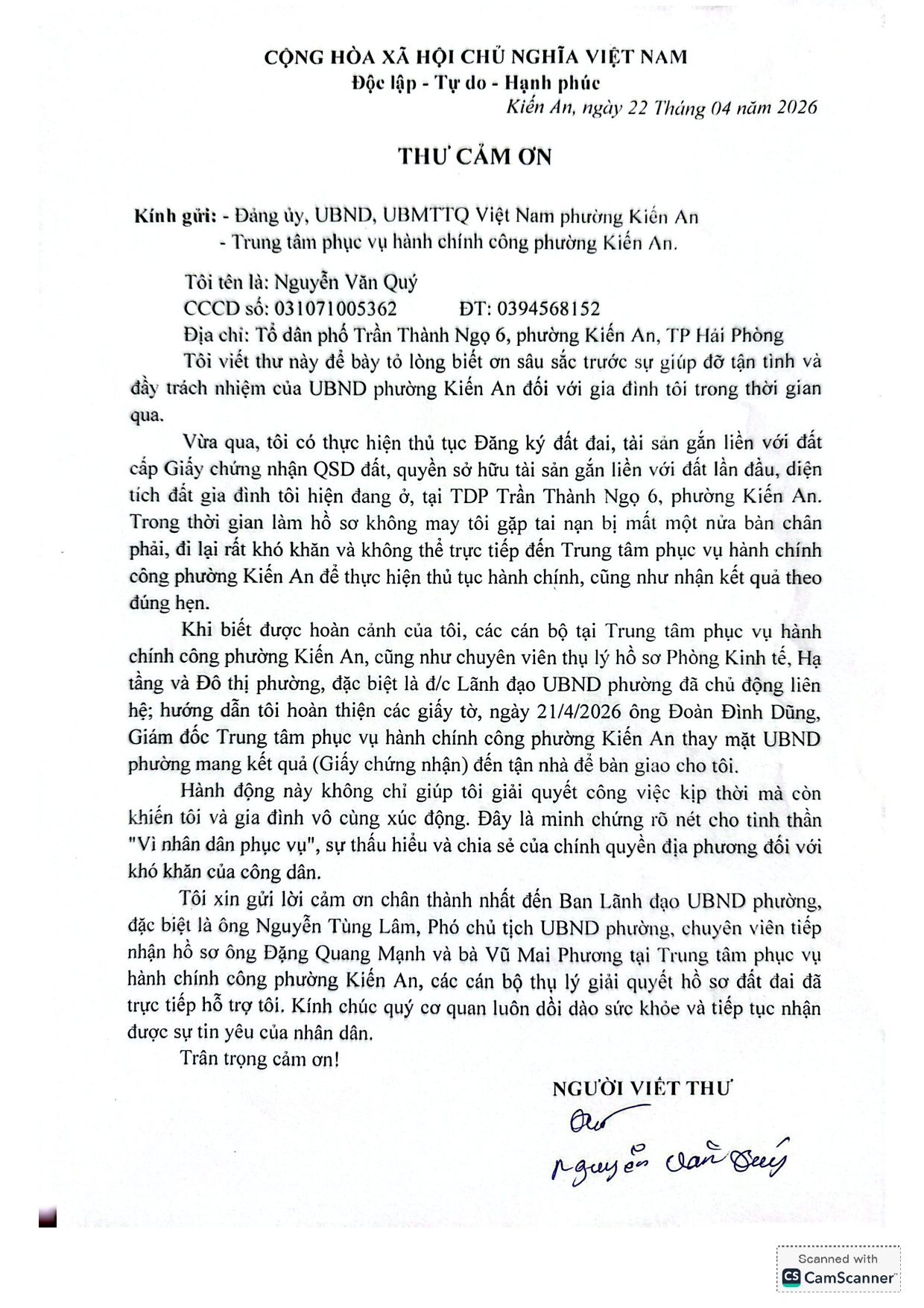 Tại buổi trao giấy chứng nhận, ông Nguyễn Văn Quý trân trọng cảm ơn sự quan tâm, tạo điều kiện giúp đỡ của Trung tâm Phục vụ Hành chính công phường Kiến An không chỉ tiếp nhận, giải quyết hồ sơ của gia đình đảm bảo thời gian, theo đúng quy định mà còn cảm thông cho tình trạng sức khỏe của ông, đã trực tiếp đến trao giấy chứng nhận cho ông.