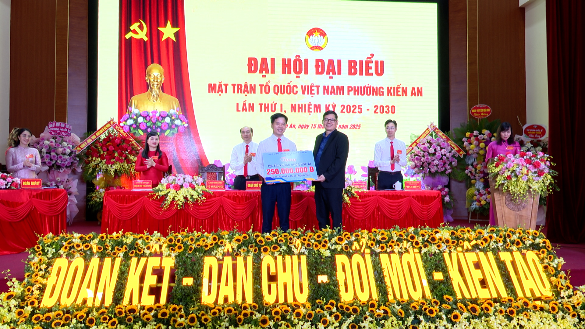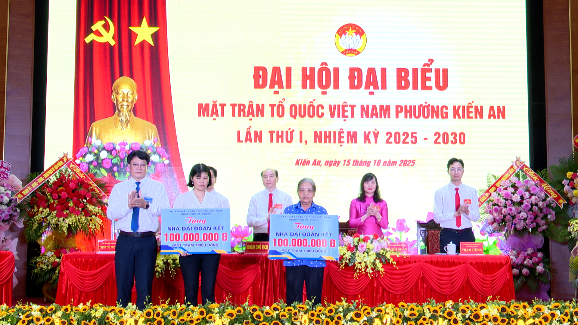 Nhân dịp này, Ban Thường trực Ủy ban Mặt trận Tổ quốc Việt Nam thành phố trao biển hỗ trợ kinh phí tặng 02 gia đình có hoàn cảnh đặc biệt khó khăn của phường, mỗi gia đình 100 triệu đồng để xây Nhà đại đoàn kết. Phường Kiến An trao biển hỗ trợ kinh phí sửa chữa nhà “Đại đoàn kết” cho 02 gia đình có hoàn cảnh đặc biệt khó khăn. Học viện Công nghệ AI Việt Nam trao biển tặng 126 tài khoản học AI trị giá 250 triệu đồng cho Mặt trận Tổ quốc Việt Nam phường.