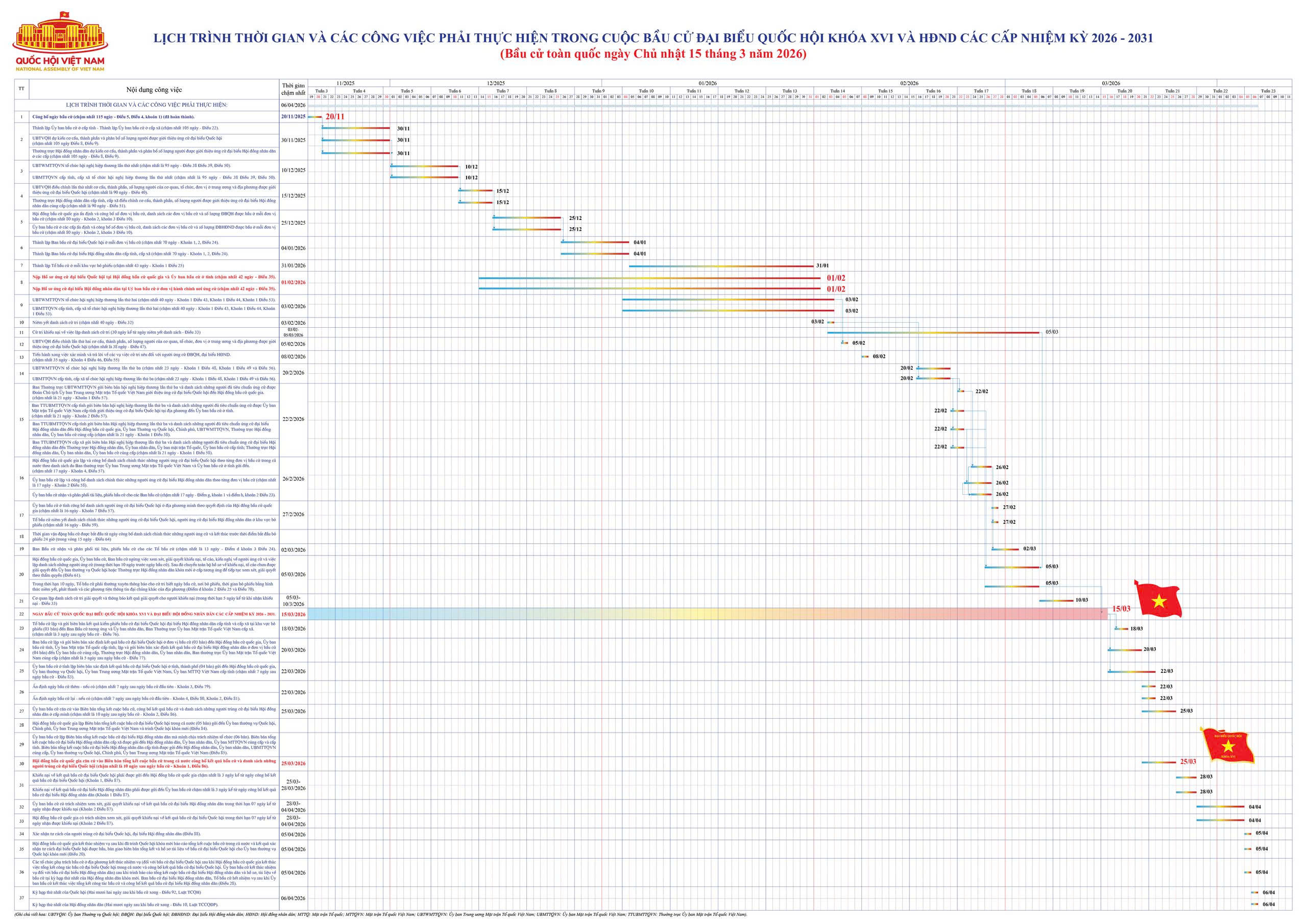 Lịch trình thời gian và các công việc phải thực hiện trong cuộc bầu cử Đại biểu Quốc hội và Đại biểu HĐND các cấp nhiệm kỳ 2026 - 2031