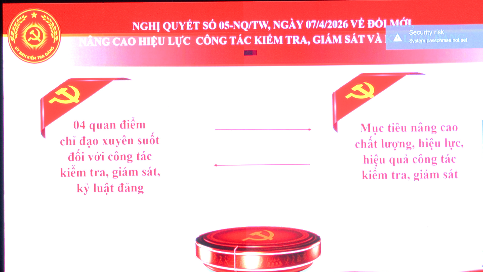 Tại hội nghị, các đại biểu được quán triệt những nội dung quan trọng Nghị quyết số 05-NQ/TW, ngày 07/4/2026 Hội nghị lần thứ hai Ban Chấp hành Trung ương Đảng khóa XIV về đổi mới, nâng cao hiệu lực công tác kiểm tra, giám sát và kỷ luật đảng và Chương trình hành động số 01-CTr/UBKTTW, ngày 10/02/2026 Ngành Kiểm tra Đảng thực hiện Nghị quyết Đại hội đại biểu toàn quốc lần thứ XIV của Đảng; những điểm mới trong Quy định số 21-QĐ/TW, ngày 11/4/2026 của Ban Chấp hành Trung ương Đảng khoá XIV về công tác kiểm tra, giám sát và kỷ luật của Đảng.