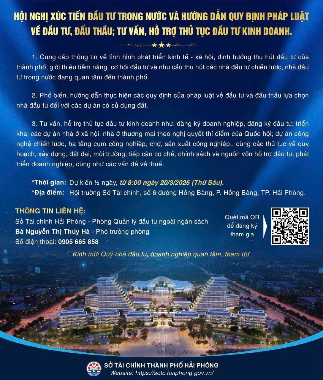 Hội nghị xúc tiến đầu tư trong nước và hướng dẫn quy định pháp luật về đầu tư, đấu thầu; tư vấn, hỗ trợ thủ tục đầu tư kinh doanh trên địa bàn thành phố Hải Phòng diễn ra vào ngày 20/3/2026