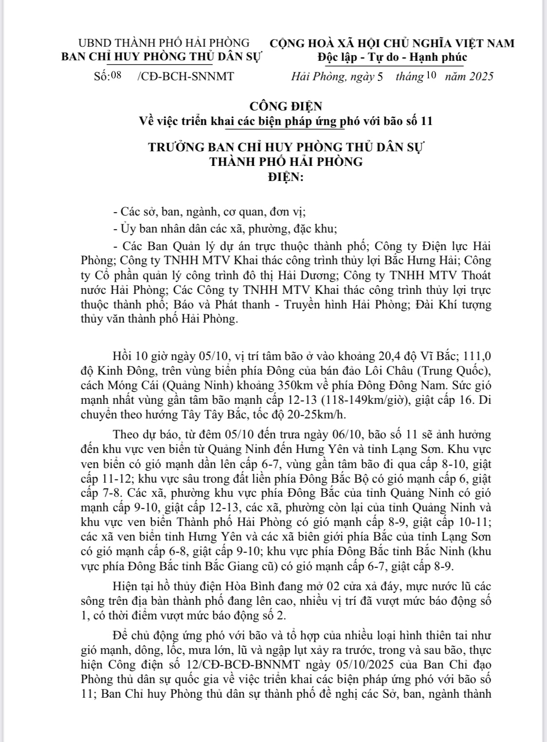 CÔNG ĐIỆN Về việc triển khai các biện pháp ứng phó với bão số 11