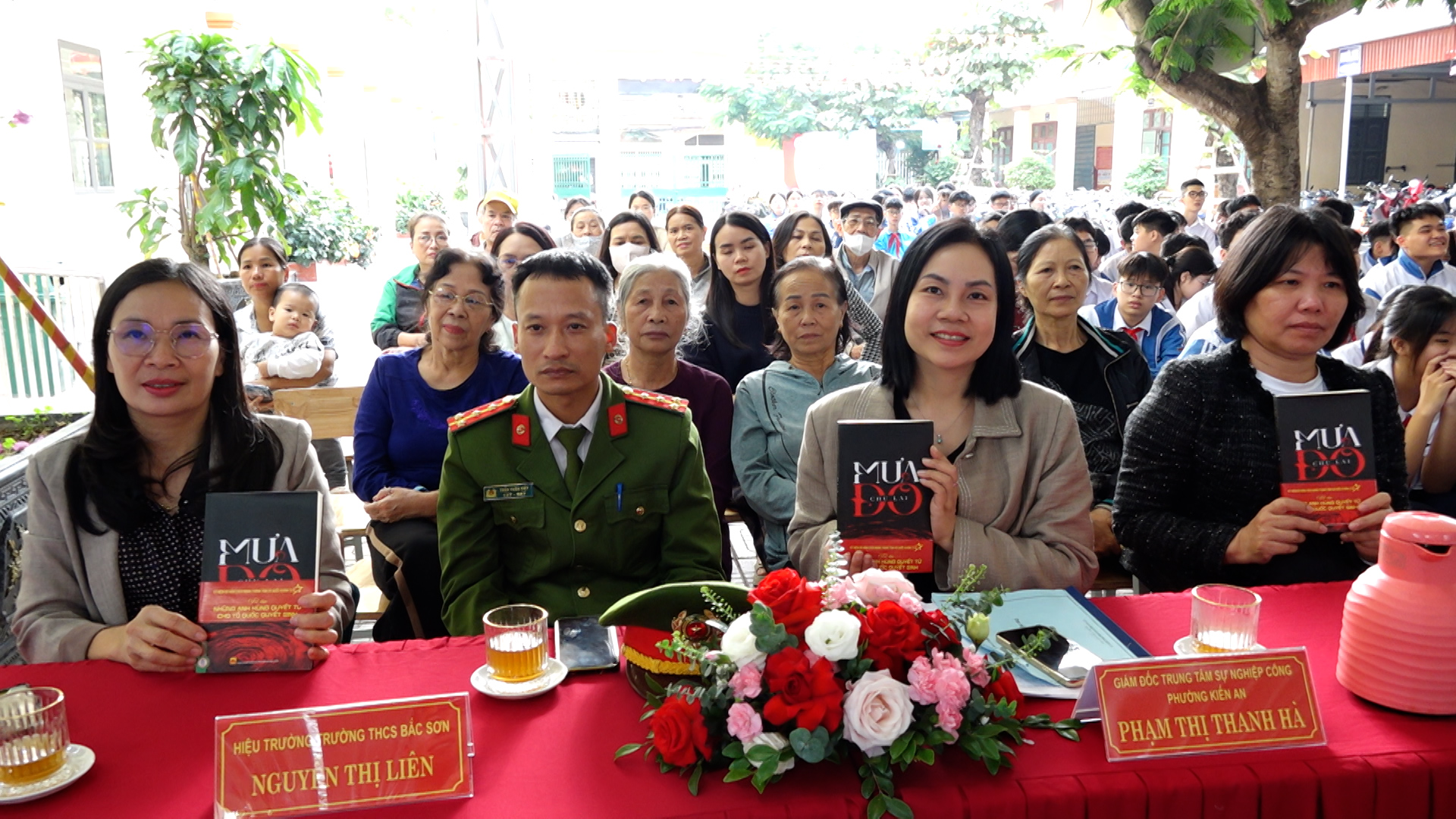 Cán bộ, giáo viên, nhân viên và học sinh trường THCS Bắc Sơn cùng nhân dân trên địa bàn tổ dân phố Hoàng Thiết Tâm xem phim “Mưa đỏ”
