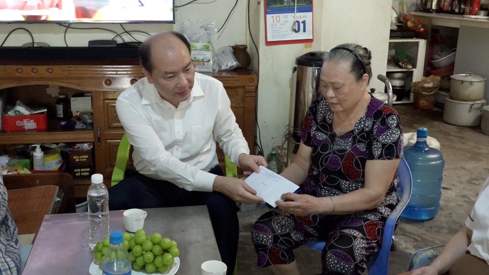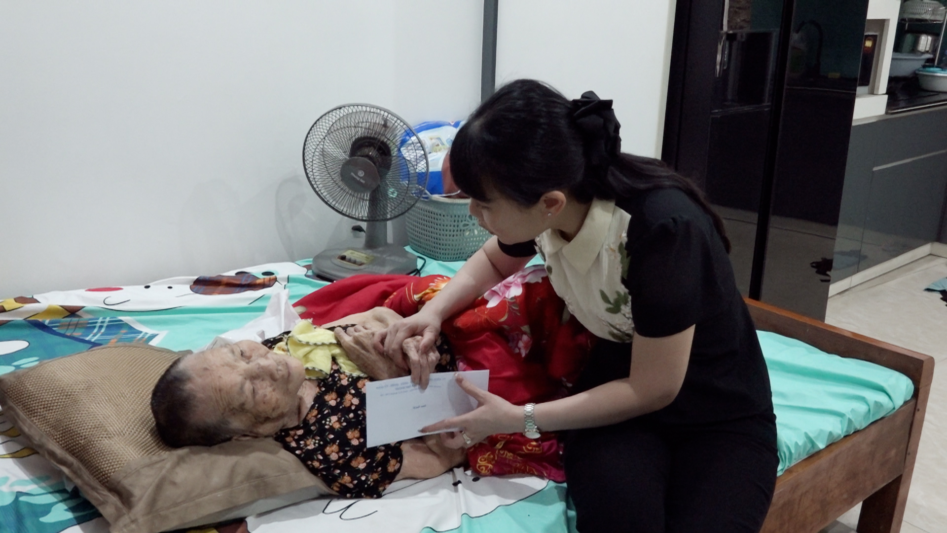 Đồng chí Nguyễn Thiện Kim - Phó Bí thư Thường trực Đảng ủy phường tặng quà cụ Đặng Thị Huyền (85 tuổi, Tổ dân phố Hoàng Thiết Tâm)