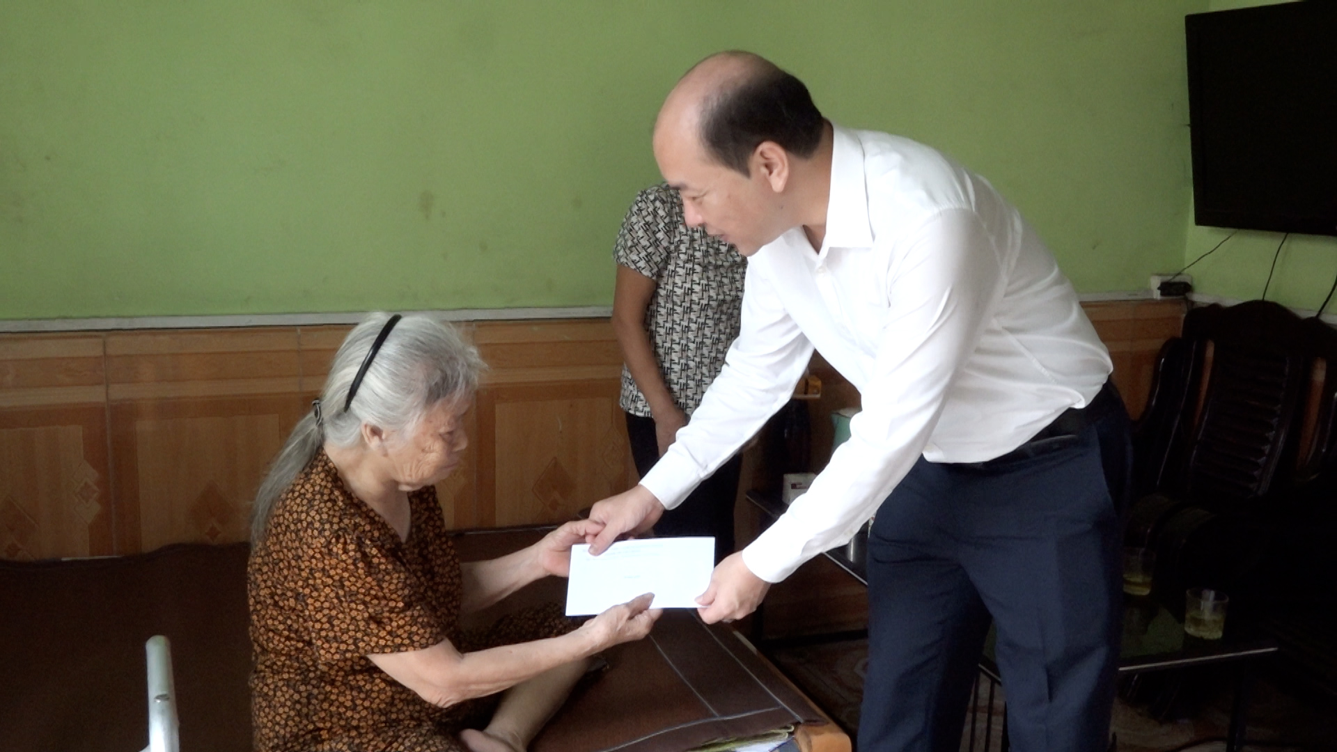 Đồng chí Nguyễn Tiến Thọ - Uỷ viên Ban Thường vụ Đảng uỷ, Phó Chủ tịch Thường trực HĐND phường tặng quà cụ Nguyễn Thị Thông (100 tuổi, Tổ dân phố Tân Khê)