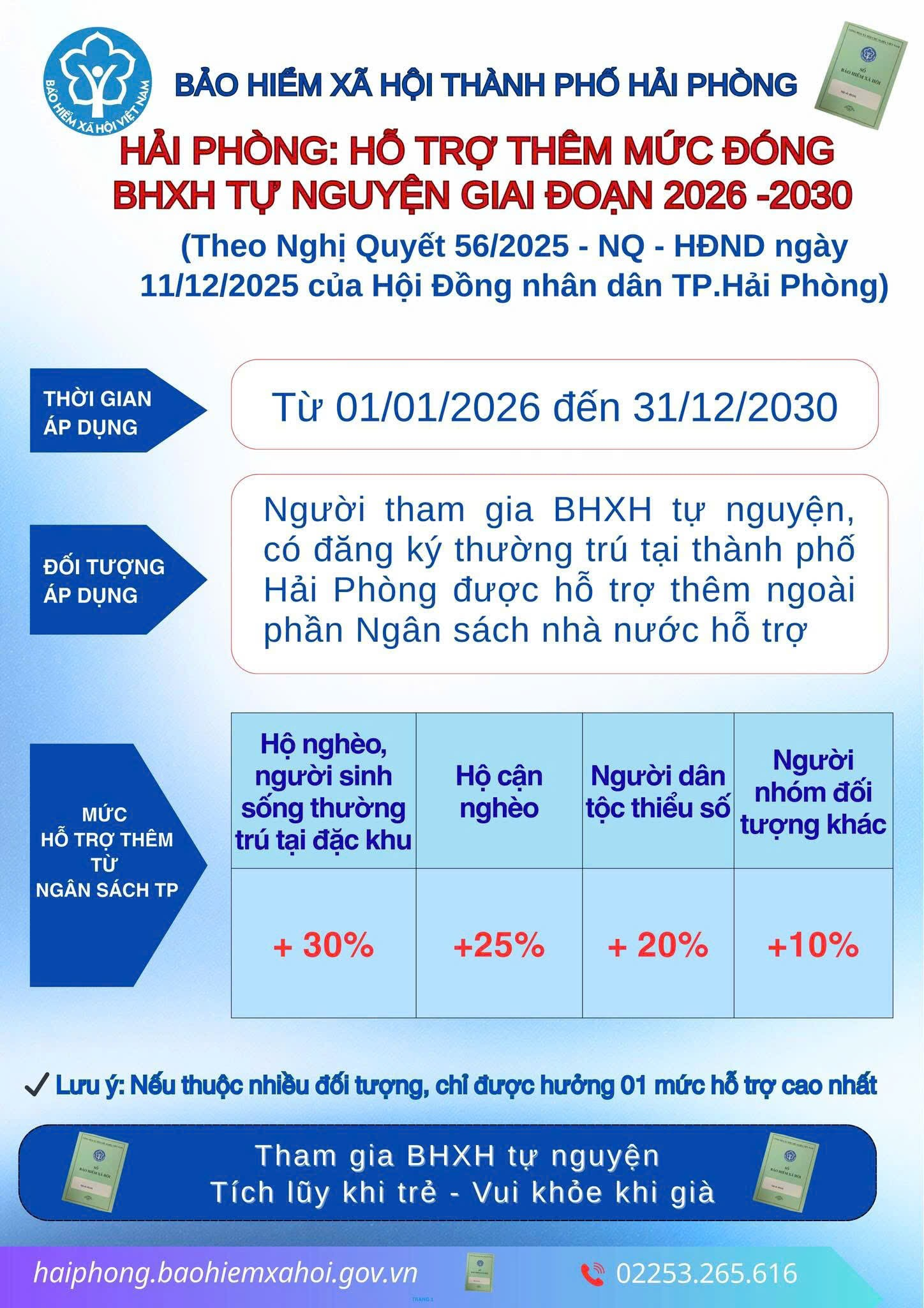 HẢI PHÒNG TRIỂN KHAI CHÍNH SÁCH HỖ TRỢ THÊM MỨC ĐÓNG BẢO HIỂM XÃ HỘI TỰ NGUYỆN GIAI ĐOẠN 2026 – 2030