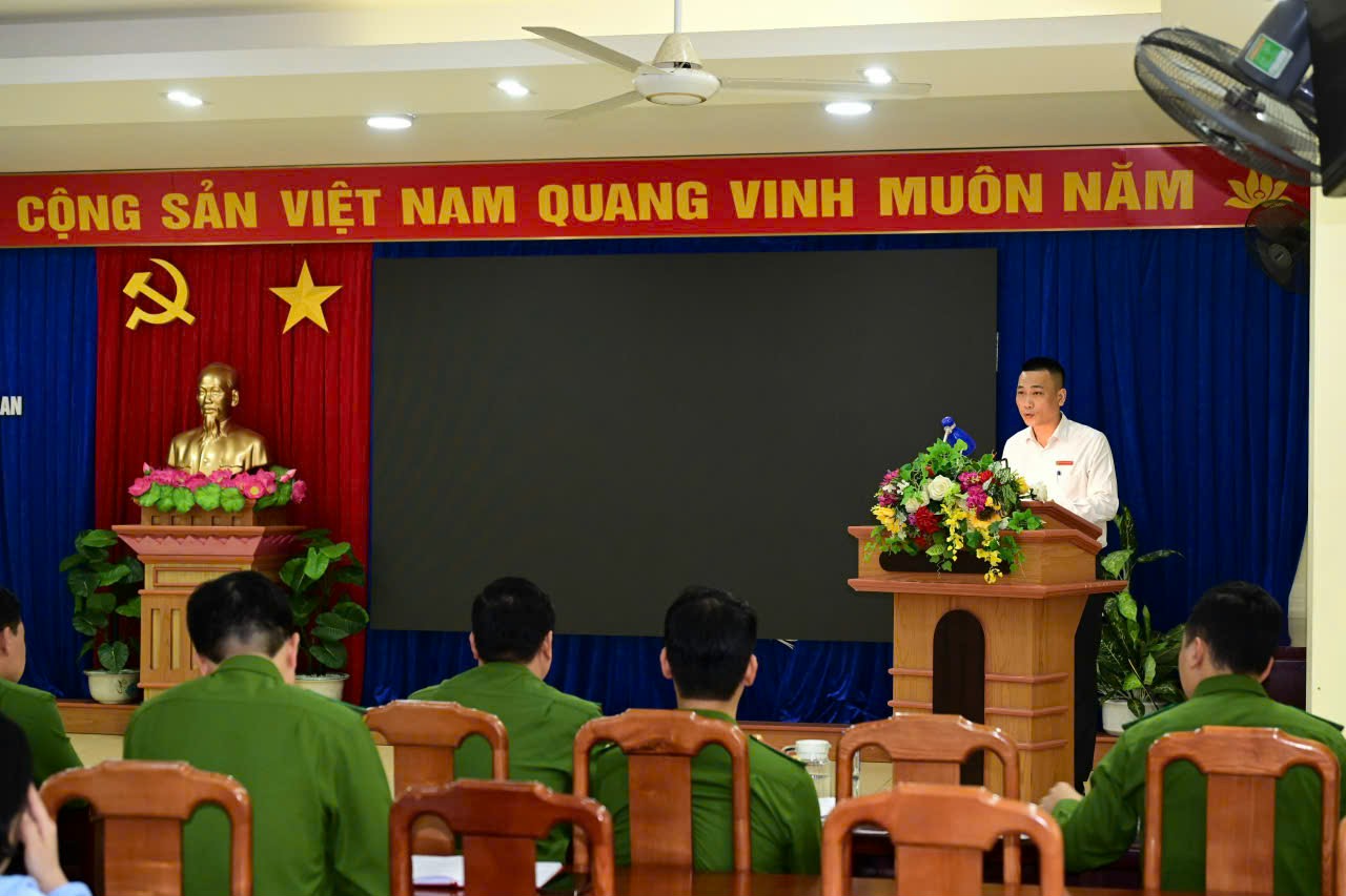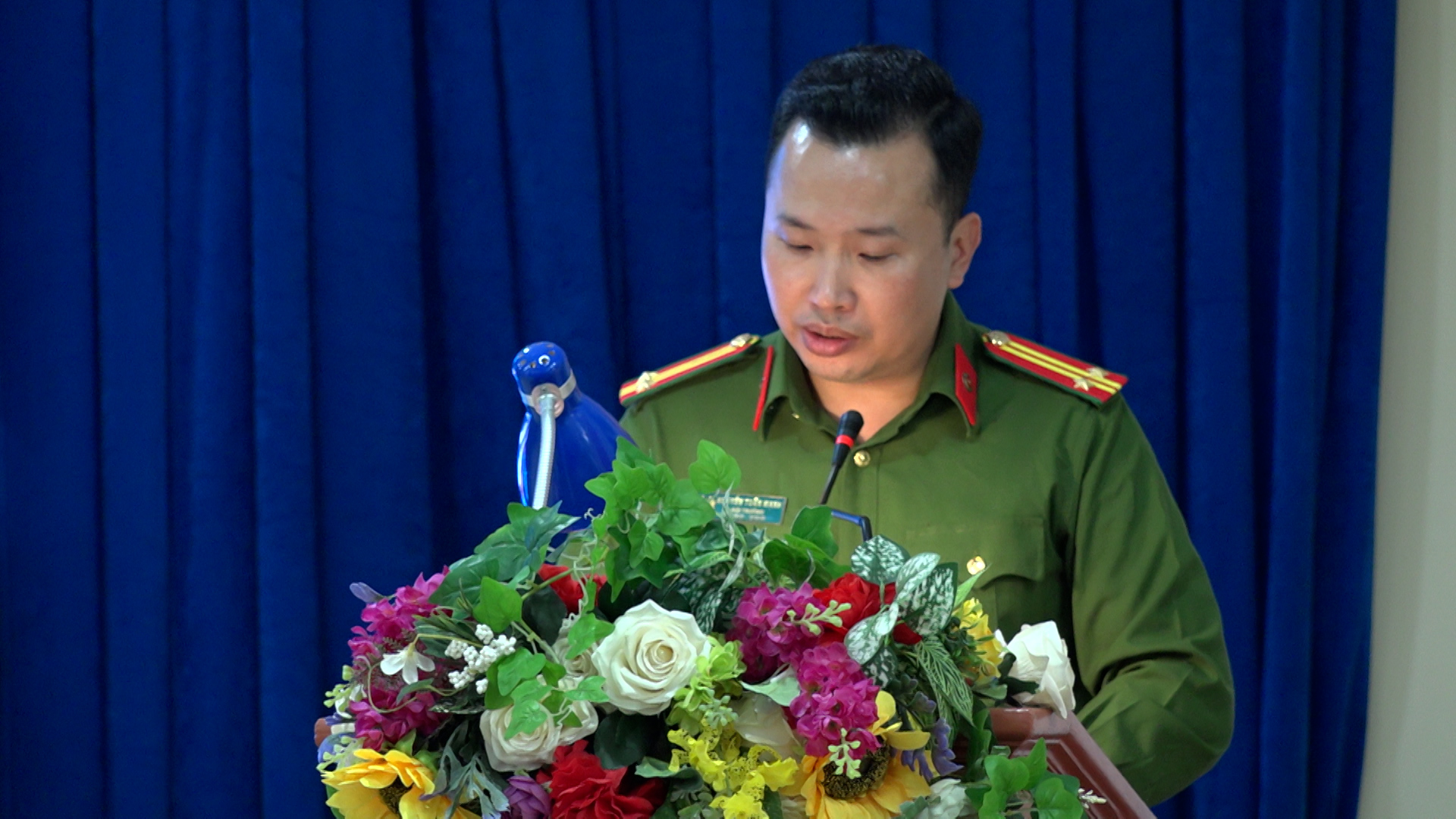 Đồng chí Thượng tá Đinh Phúc Long - Ủy viên Ban Thường vụ Đảng ủy phường, Trưởng Công an phường phát biểu tại Hội nghị