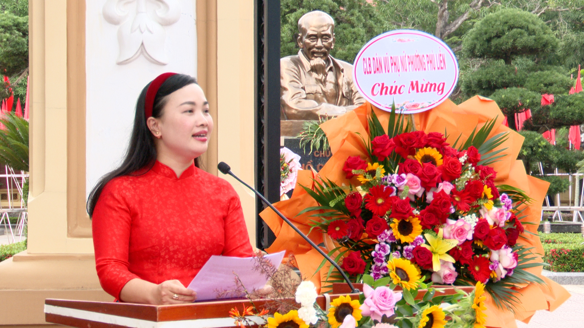 Đồng chí Trịnh Thị Thùy Linh - Ủy viên Đảng ủy, Chủ tịch Hội Liên hiệp phụ nữ phường trình bày diễn văn kỷ niệm 95 năm ngày thành lập Hội Liên hiệp phụ nữ Việt Nam và Khai mạc chương trình Liên hoan.