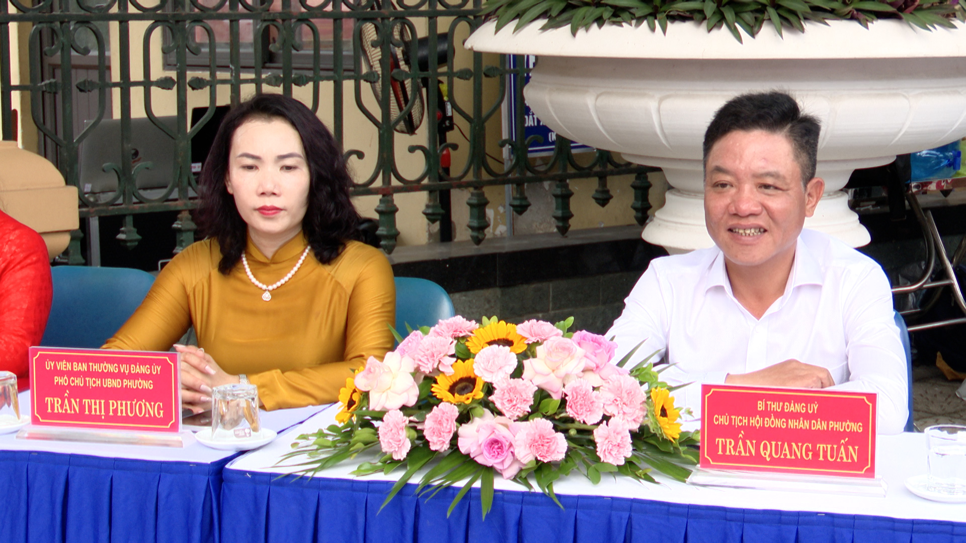 Đồng chí Trần Quang Tuấn – Bí thư Đảng ủy, Chủ tịch Hội đồng nhân dân phường, đồng chí Trần Thị Phương - Ủy viên Ban Thường vụ Đảng ủy phường, Phó Chủ tịch Ủy ban nhân dân phường tặng hoa chúc mừng các Câu lạc bộ dân vũ tham gia Liên hoan.