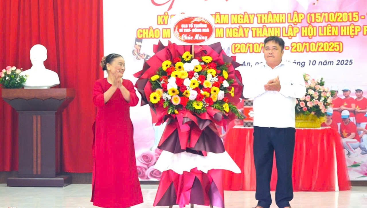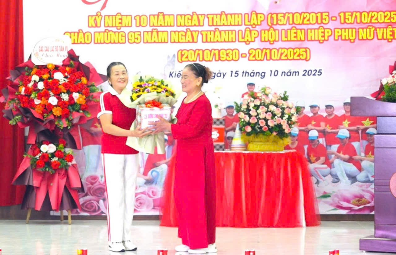 Đại diện lãnh đạo Hội Liên hiệp Phụ nữ phường, Trung tâm sự nghiệp công phường; đại diện các Câu lạc bộ dân vũ tặng hoa, quà chúc mừng Câu lạc bộ Dưỡng sinh Đồng Hòa - Mỹ Khê nhân kỷ niệm 10 năm thành lập