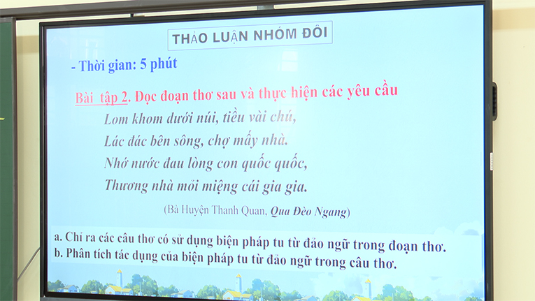 Trong tiết học, học sinh được tham gia trò chơi khởi động “Viên ngọc bí ẩn”, làm việc theo nhóm thực hiện dự án tìm hiểu đặc điểm, tác dụng của biện pháp tu từ đảo ngữ với sự hỗ trợ của trợ lý ảo AI. Các em được rèn luyện kỹ năng thuyết trình, phản biện, sáng tạo khi sử dụng công cụ AI để trình bày kết quả. Tiết học trở nên sinh động, giàu cảm xúc và mang đậm tính tương tác, giúp học sinh vừa nắm chắc kiến thức, vừa phát triển năng lực ngôn ngữ, giao tiếp, hợp tác và tư duy sáng tạo. Đặc biệt, trong phần vận dụng, học sinh sử dụng hình ảnh và video được tạo bằng Canva AI để viết đoạn văn cảm nhận về bức tranh mùa thu trong bài “Thu điếu” của Nguyễn Khuyến, qua đó thấy rõ hiệu quả của việc ứng dụng công nghệ vào học tập Ngữ văn.
