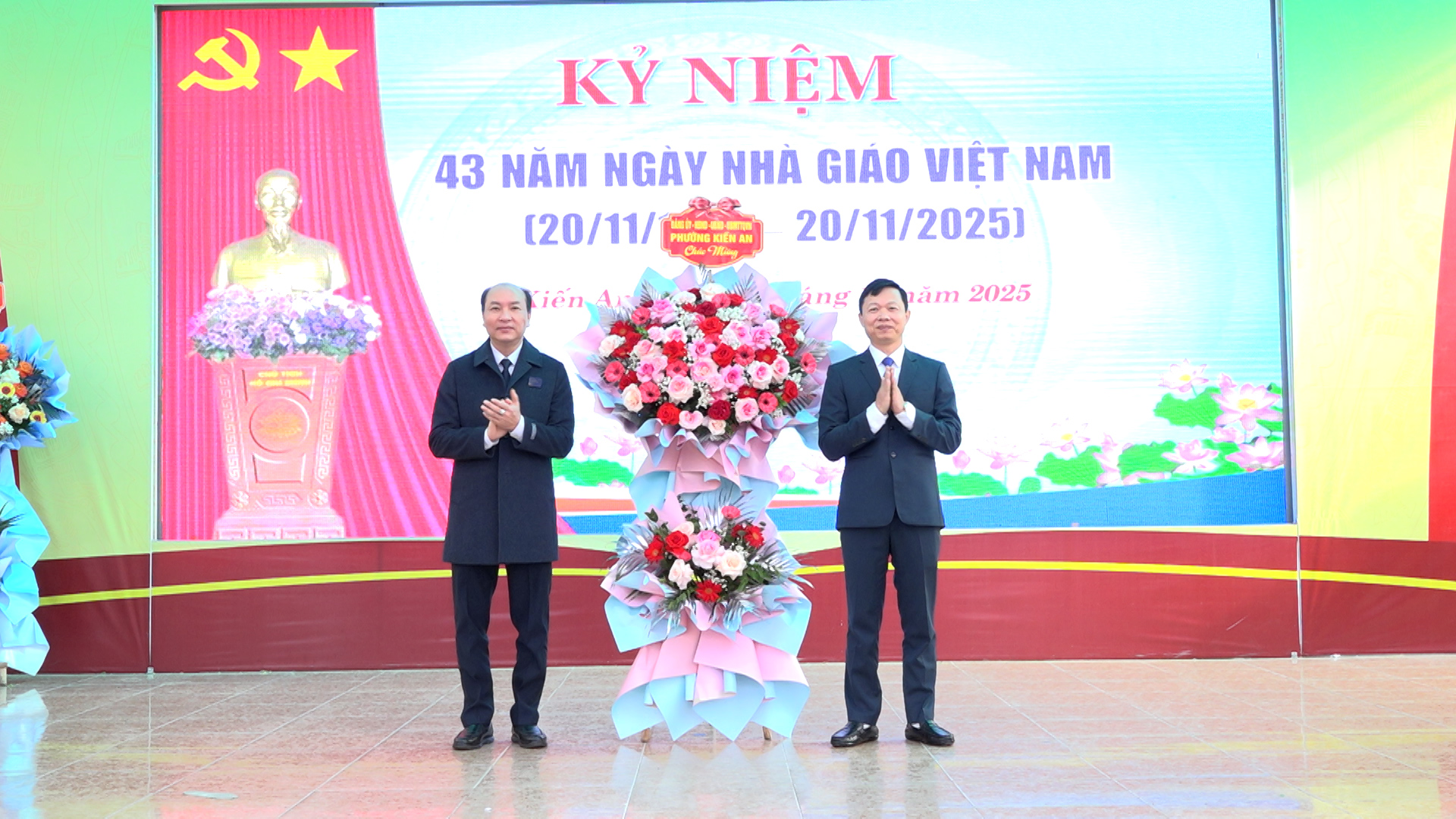 Đồng chí Nguyễn Thiện Kim – Phó Bí thư Thường trực Đảng uỷ phường  và Thầy giáo Lê Văn Hùng - Bí thư Chi bộ, Hiệu trưởng nhà trường tặng hoa các nhà giáo nguyên là cán bộ quản lý, giáo viên, nhân viên của trường