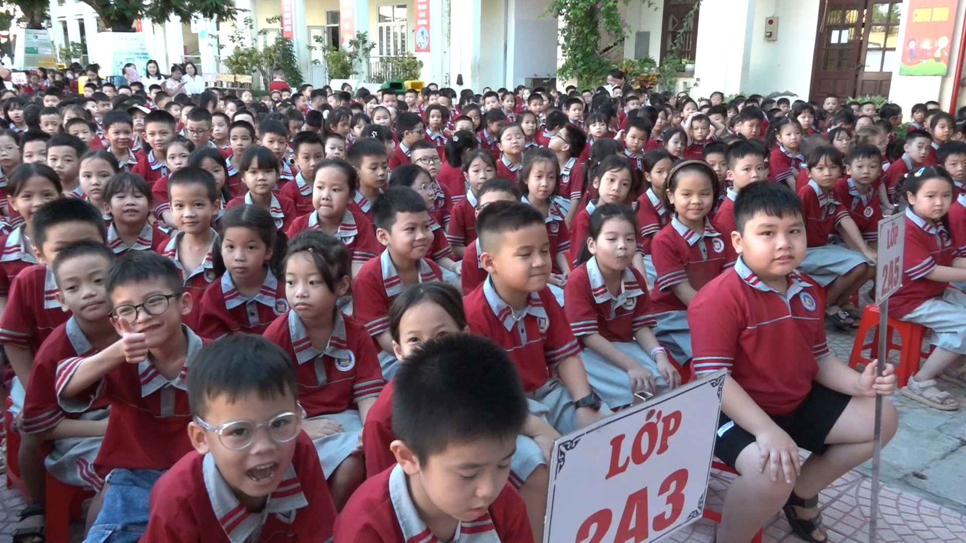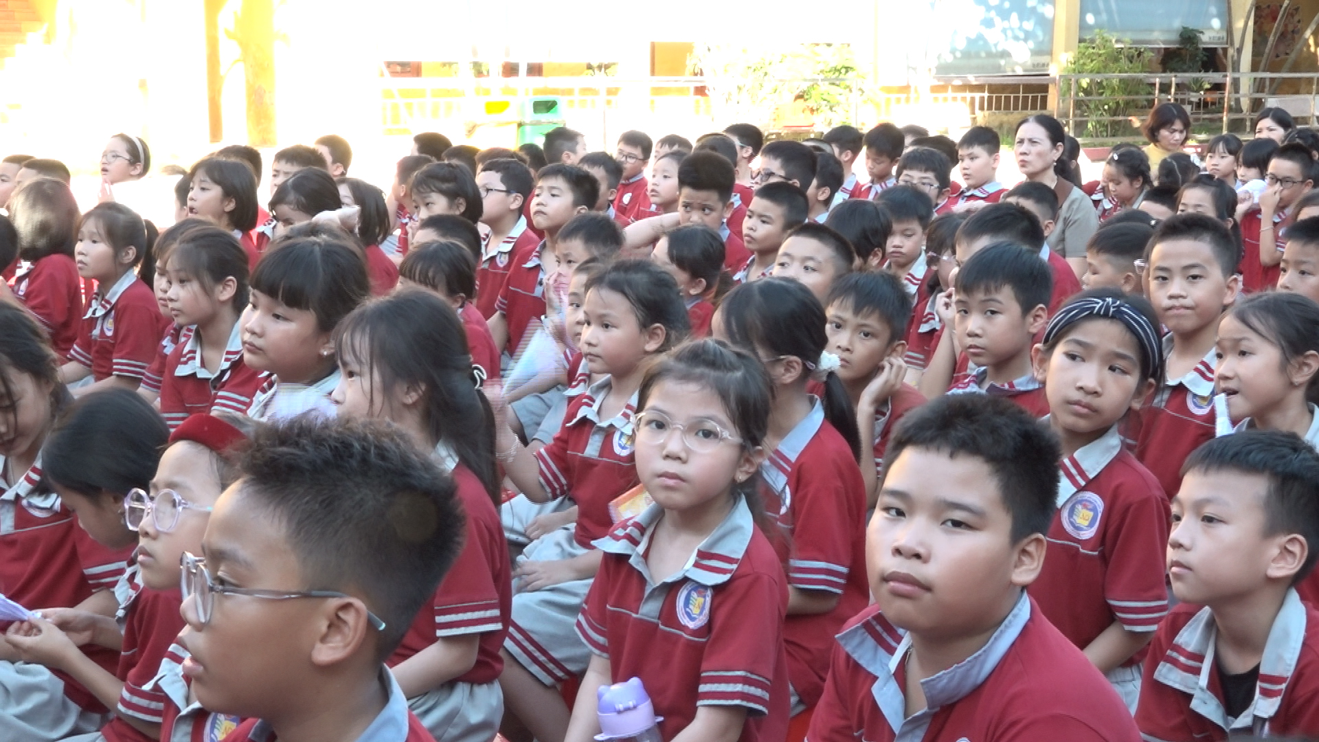 Các em học sinh trường Tiểu học Nguyễn Du chăm chú nghe tuyên truyền