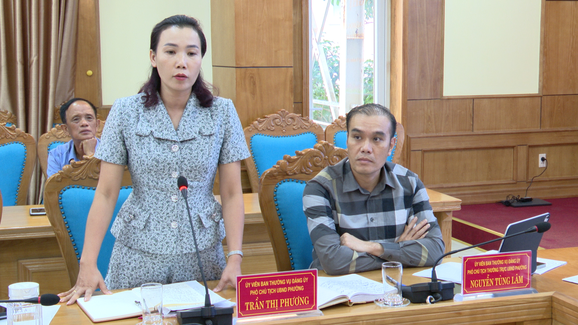 Đồng chí Trần Thị Phương – Uỷ viên Ban Thường vụ Đảng uỷ, Phó Chủ tịch UBND phường phát biểu tại hội nghị