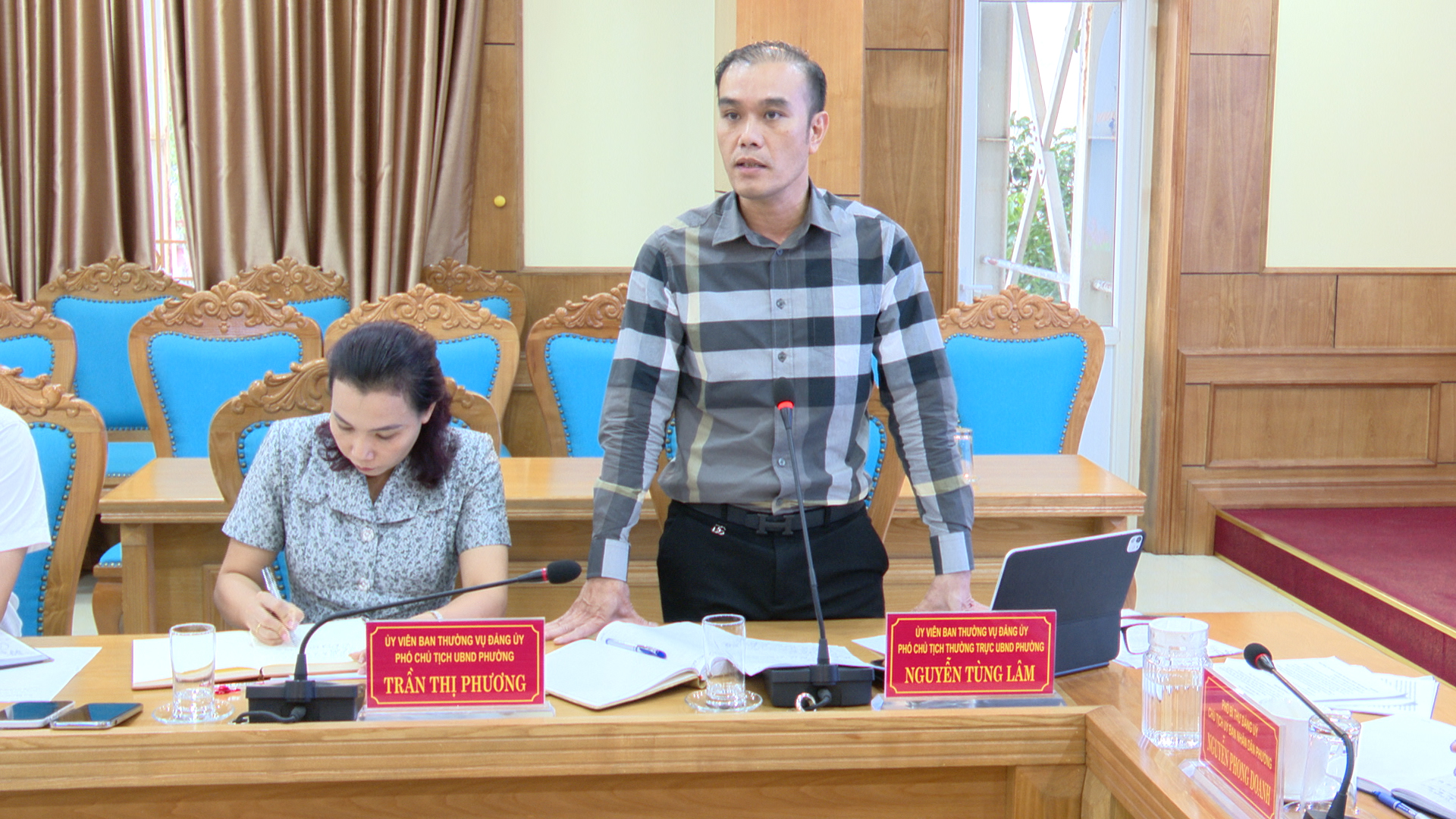 Đồng chí Nguyễn Tùng Lâm - Uỷ viên Ban Thường vụ Đảng uỷ, Phó Chủ tịch Thường trực UBND phường phát biểu tại hội nghị