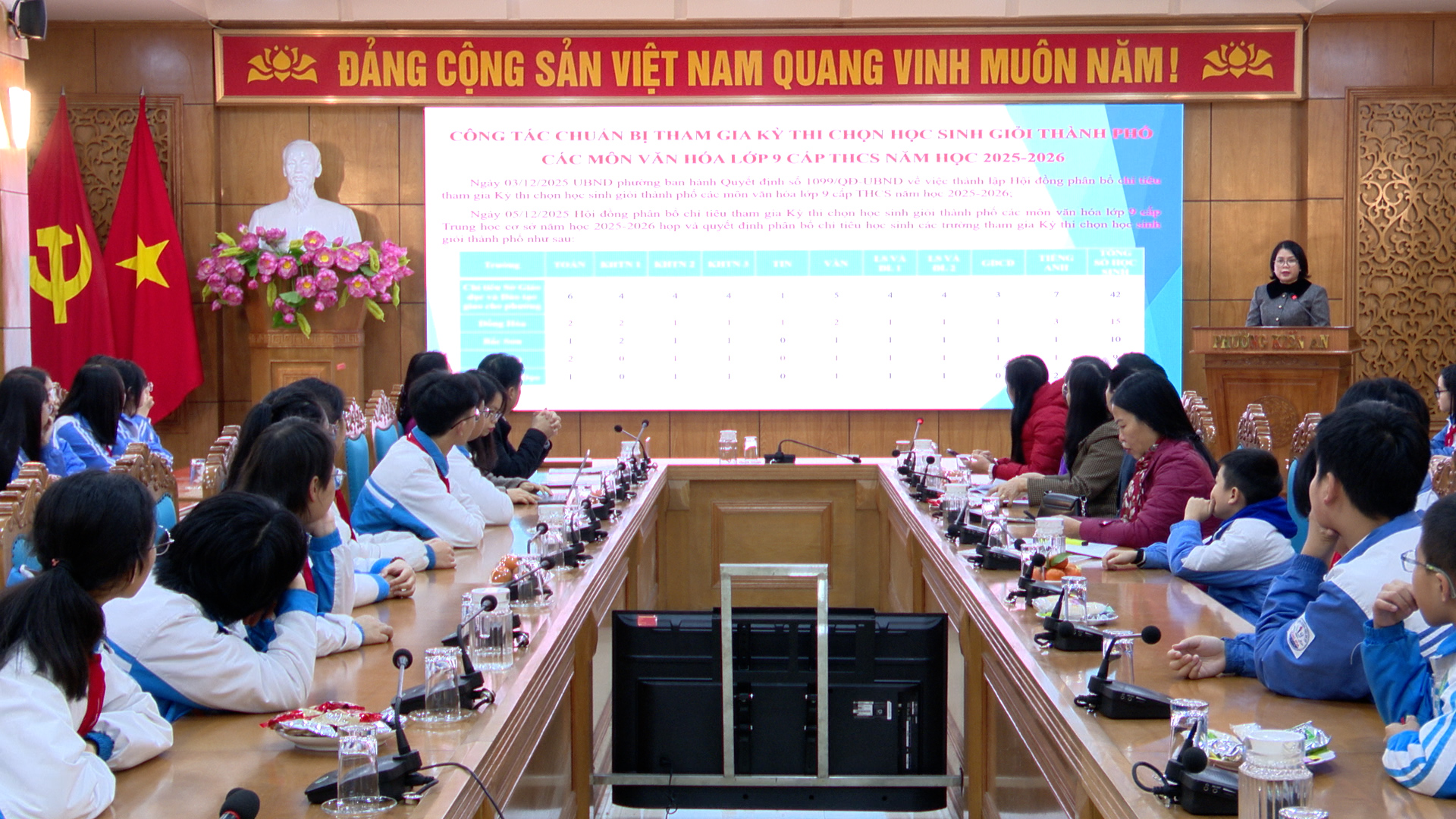 Đồng chí Hoàng Thị Hương – Trưởng phòng Văn hóa - Xã hội phường báo cáo Công tác chuẩn bị tham gia Kỳ thi chọn học sinh giỏi thành phố các môn văn hóa lớp 9 cấp Trung học cơ sở và tham dự Giải cờ vua học sinh TH, THCS thành phố Hải Phòng năm học 2025-2026