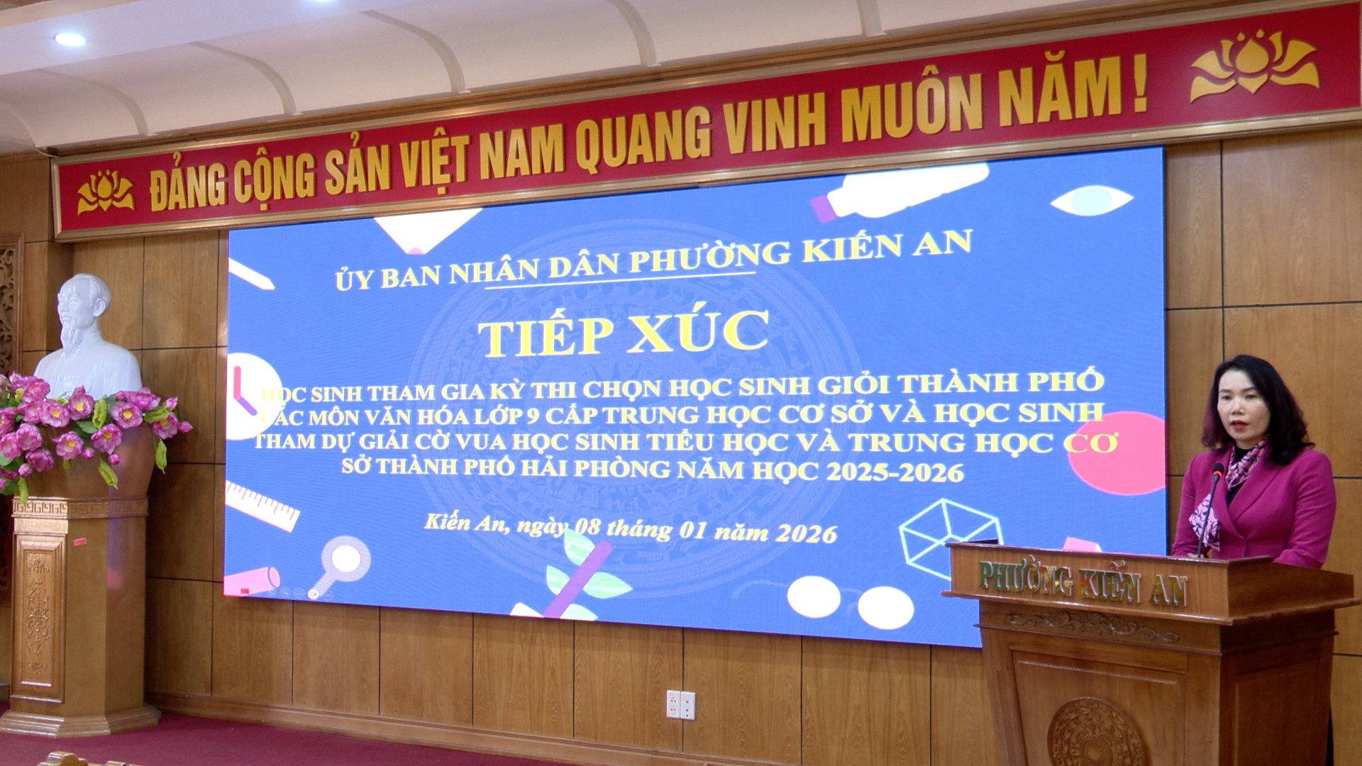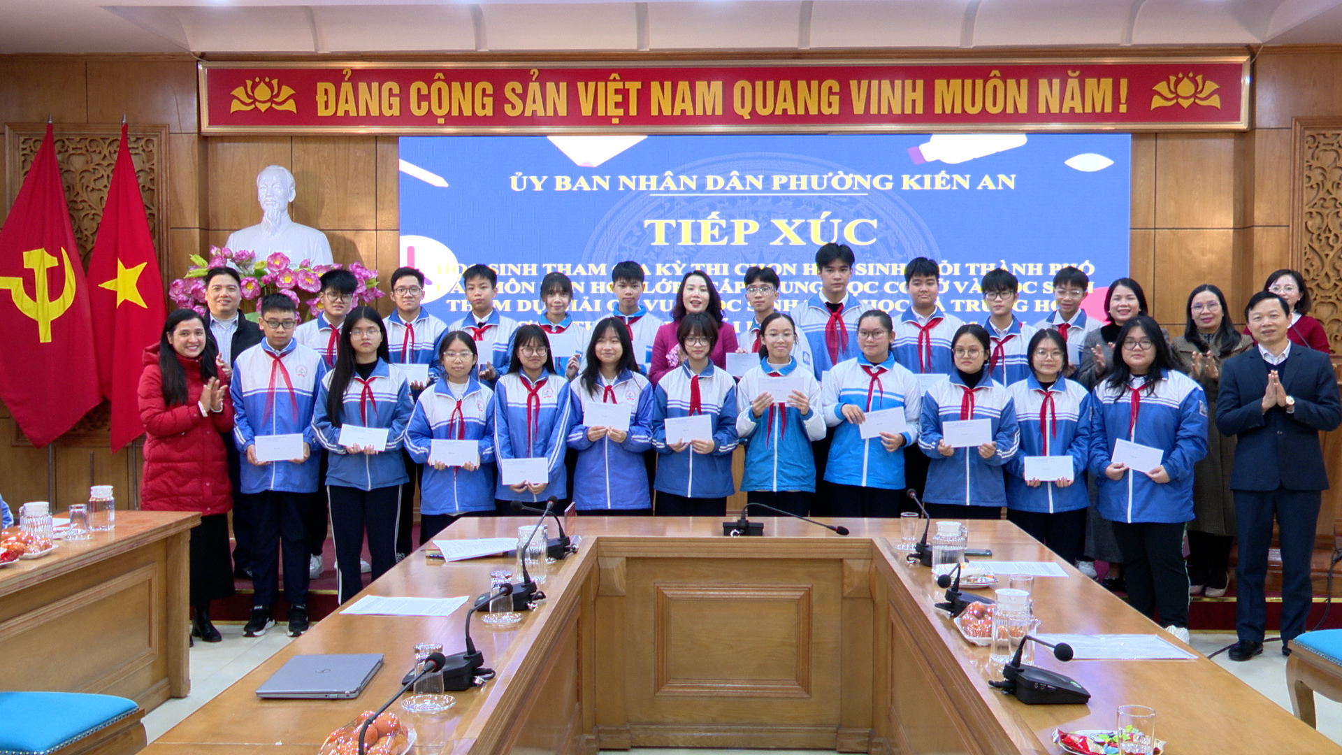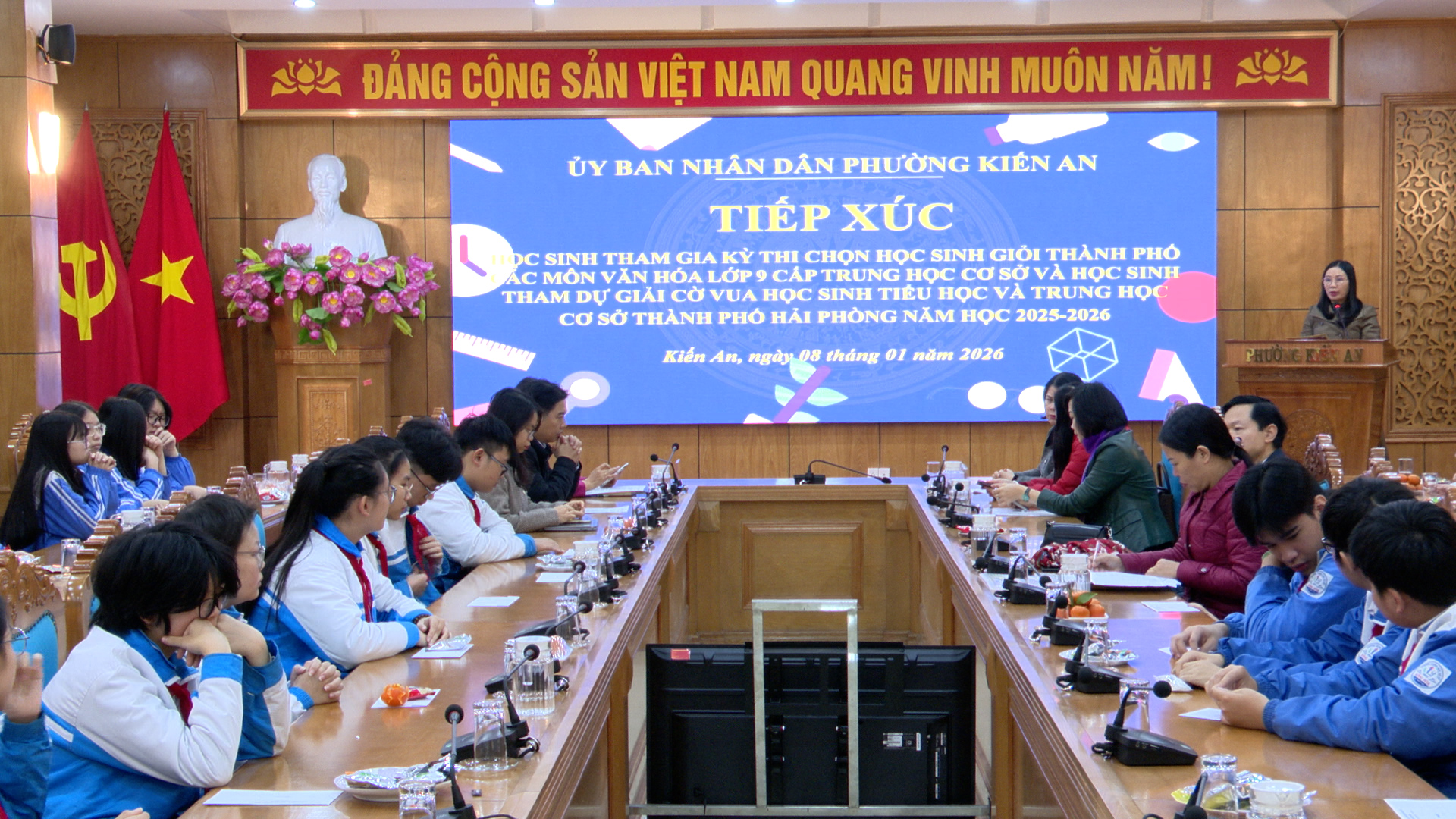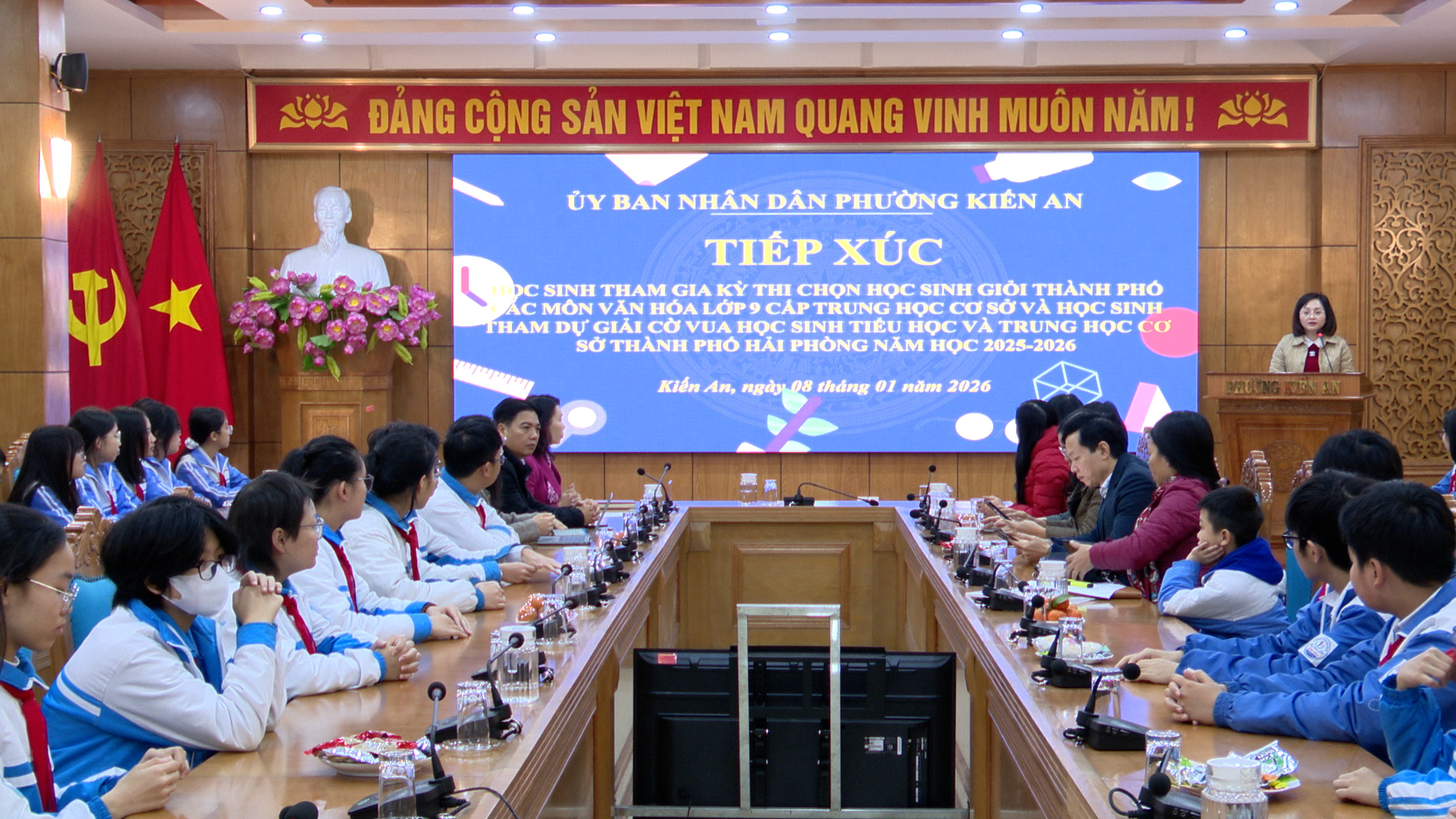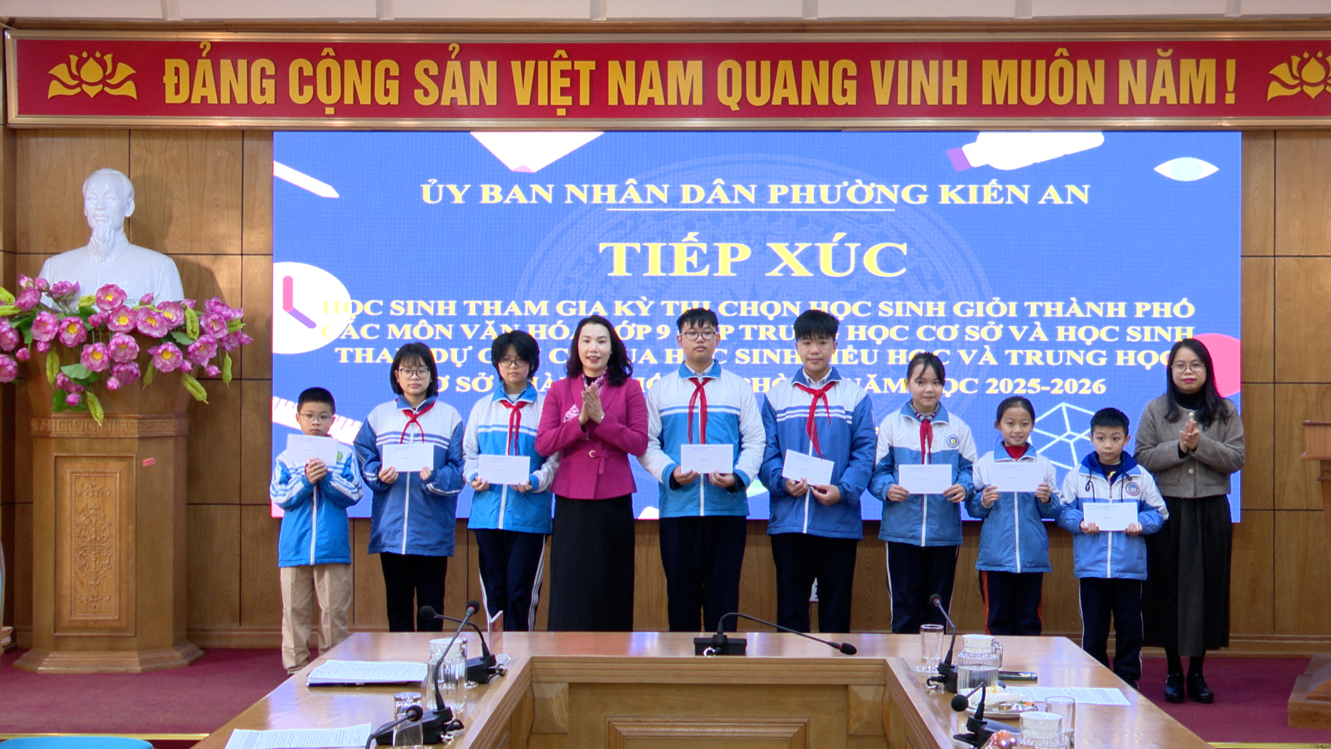 Sáng ngày 08/01, Ủy ban nhân dân phường Kiến An tổ chức buổi tiếp xúc, gặp mặt các em học sinh tham gia Kỳ thi chọn học sinh giỏi thành phố các môn văn hóa lớp 9 cấp THCS và học sinh tham dự giải cờ vua học sinh TH, THCS thành phố năm học 2025 -2026