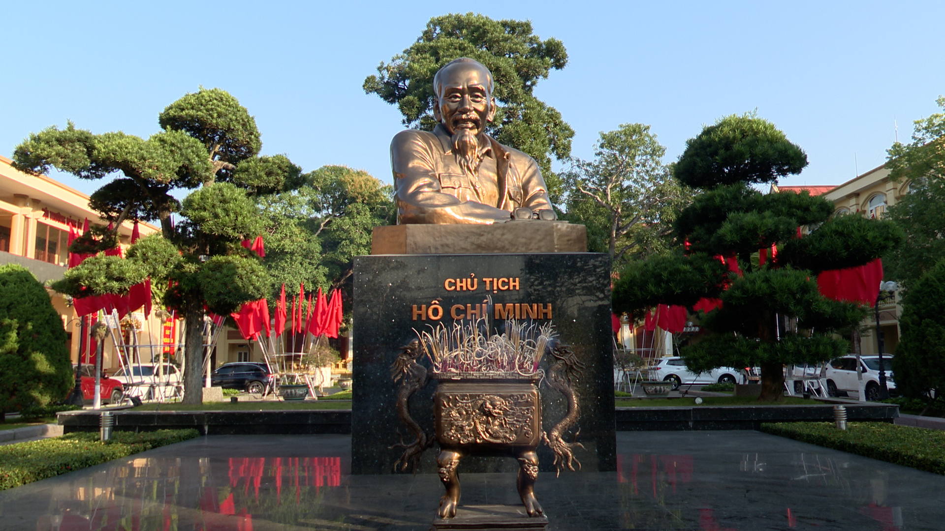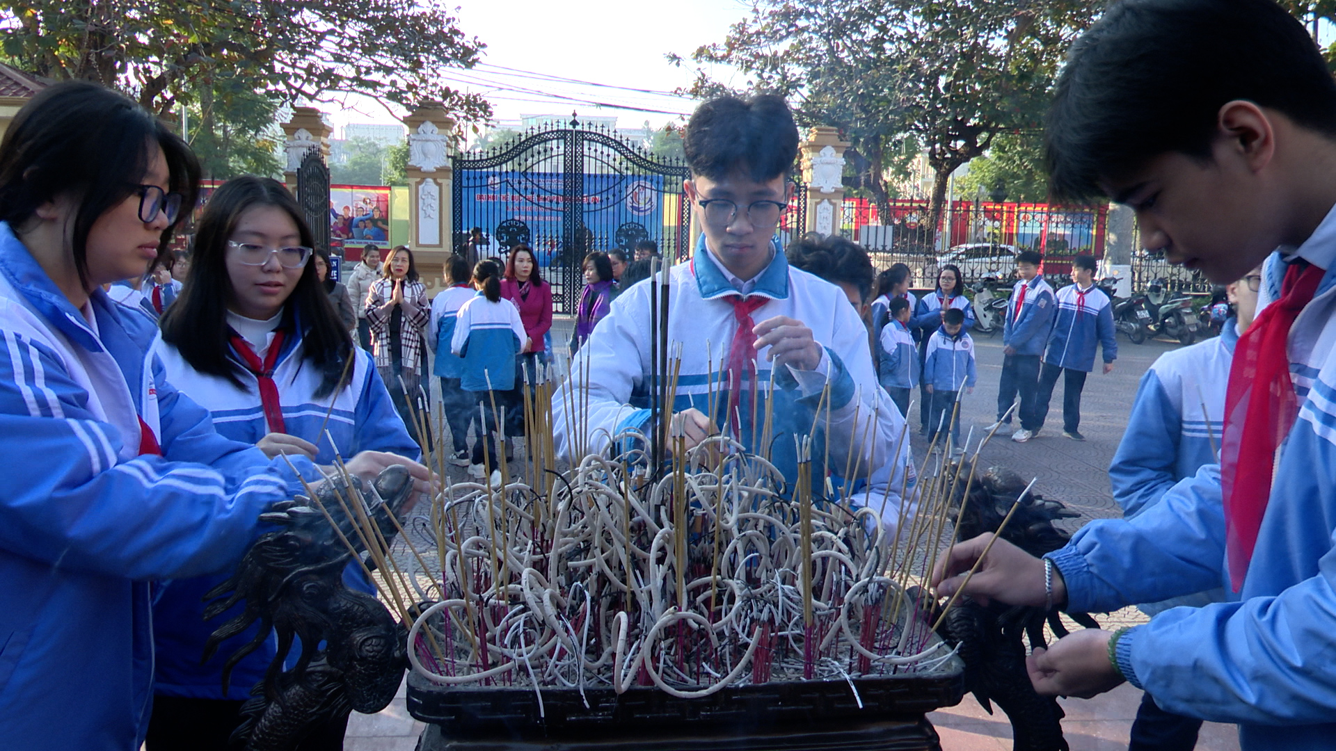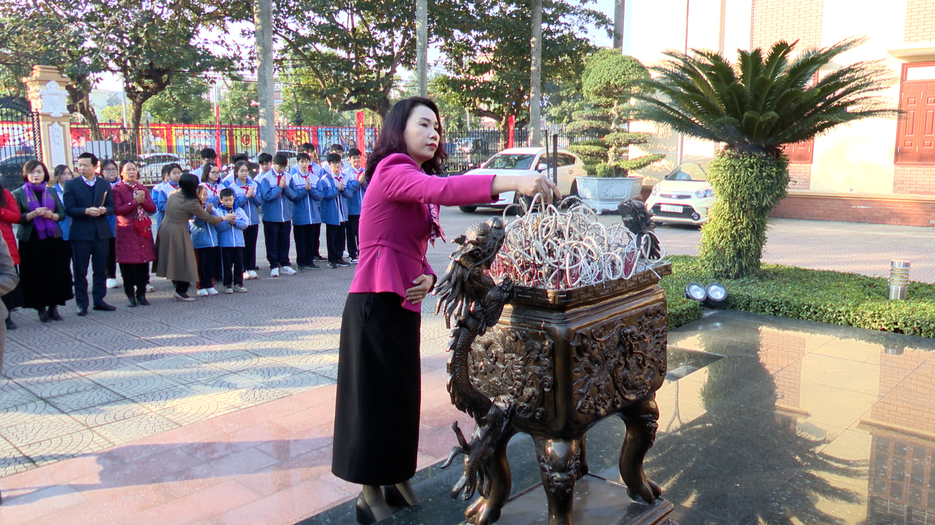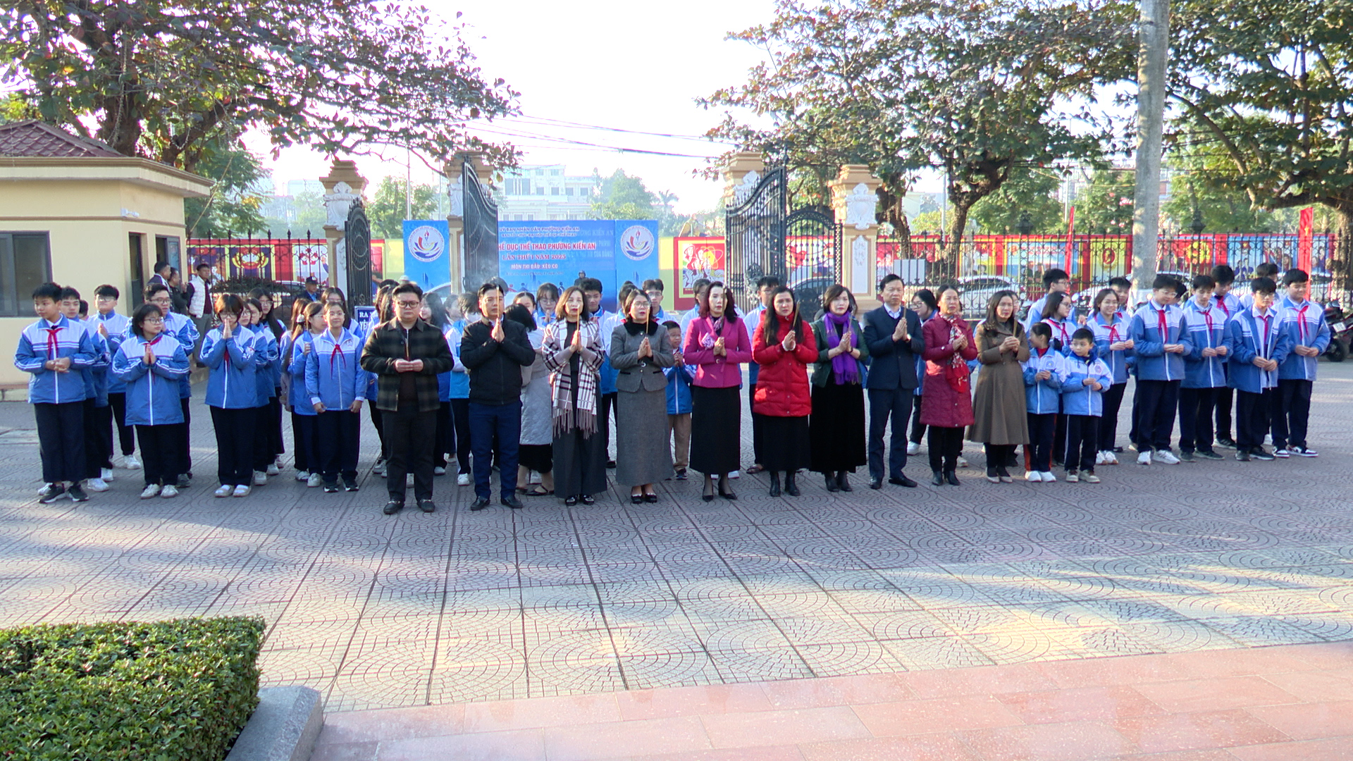 Các đại biểu và các em học sinh tham gia Kỳ thi chọn học sinh giỏi thành phố các môn văn hóa lớp 9 cấp THCS và học sinh tham dự giải cờ vua học sinh TH và THCS thành phố năm học 2025 -2026 dâng hương tượng Chủ tịch Hồ Chí Minh
