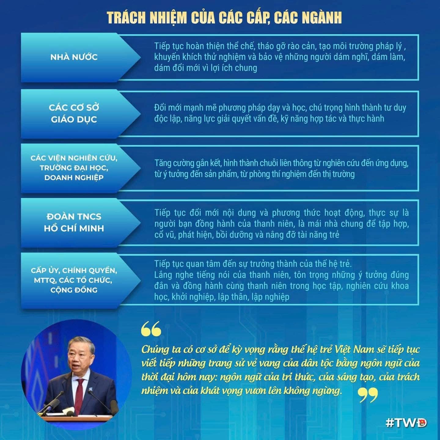 Ngày 24/3/2026, Tổng Bí thư Tô Lâm đã có bài viết “Thanh niên với tương lai đất nước”, nhân dịp 95 năm Ngày thành lập Đoàn TNCS Hồ Chí Minh (26/3/1931-26/3/2026), trong đó nhấn mạnh: Dưới ngọn cờ vẻ vang của Đảng, được Bác Hồ kính yêu và các thế hệ cách mạng dìu dắt, tuổi trẻ nước ta đã viết nên nhiều trang sử đẹp bằng lý tưởng cao cả, tinh thần yêu nước và khát vọng cống hiến.