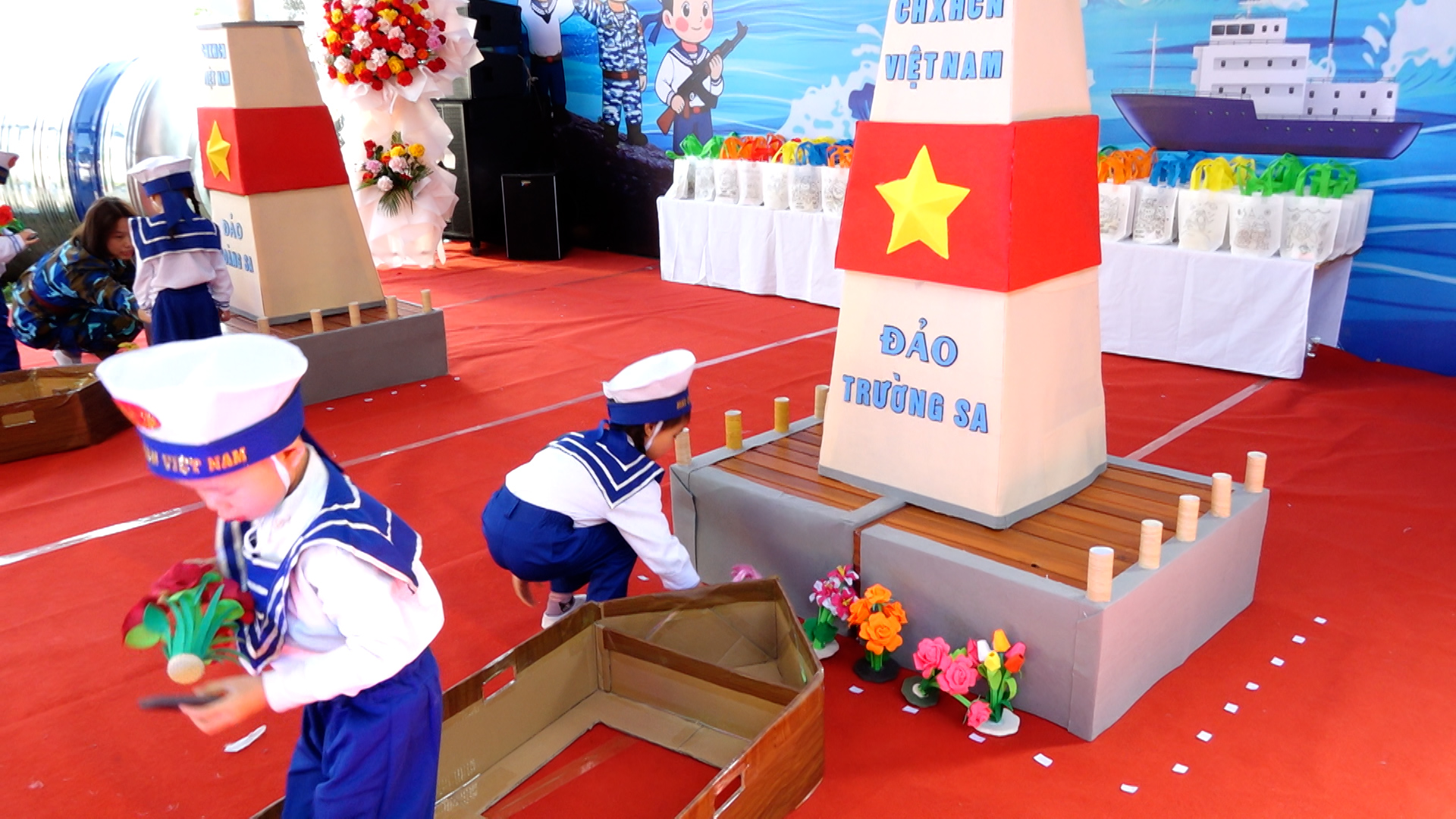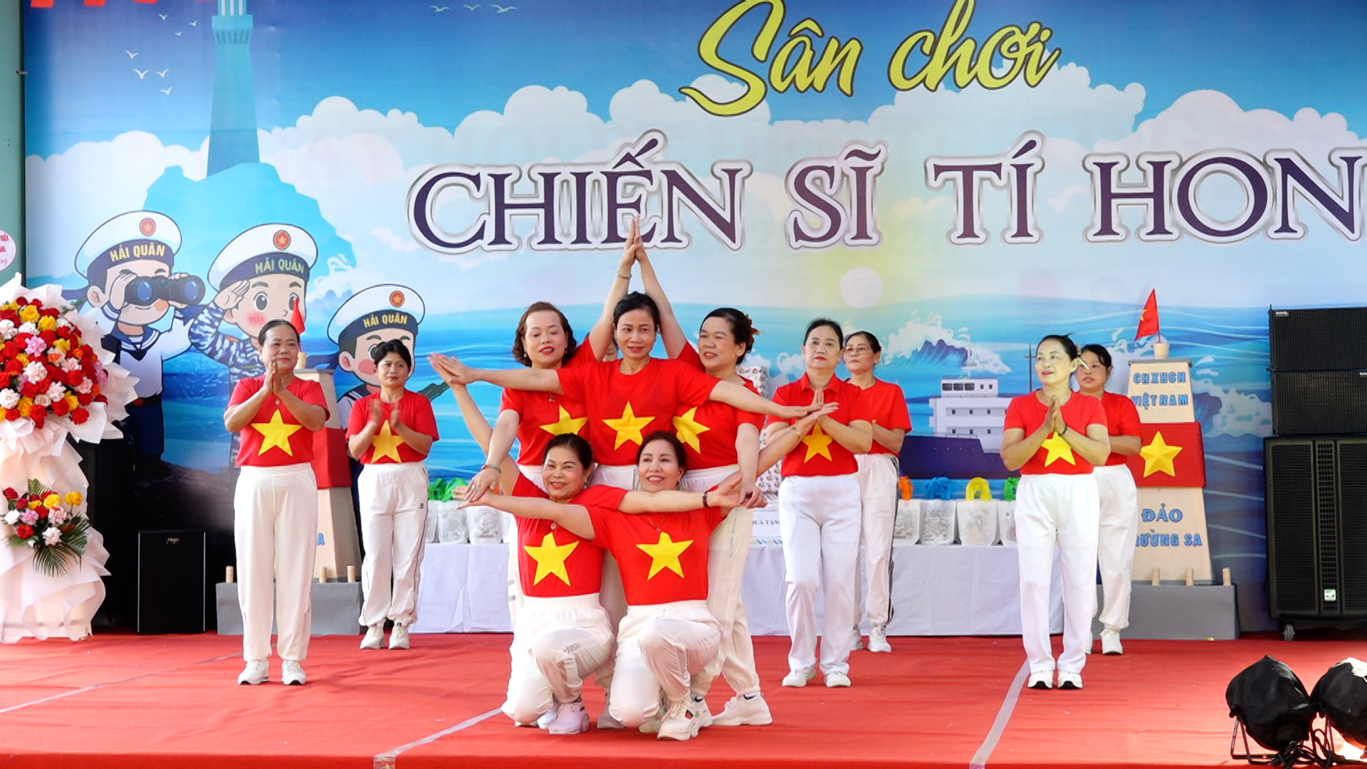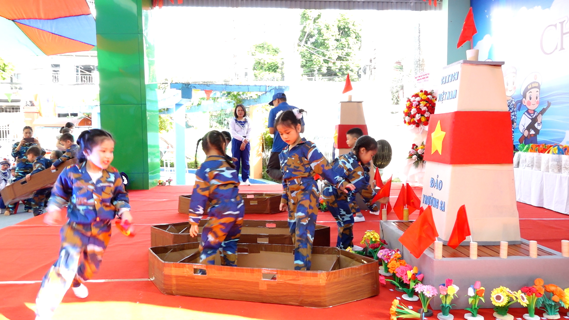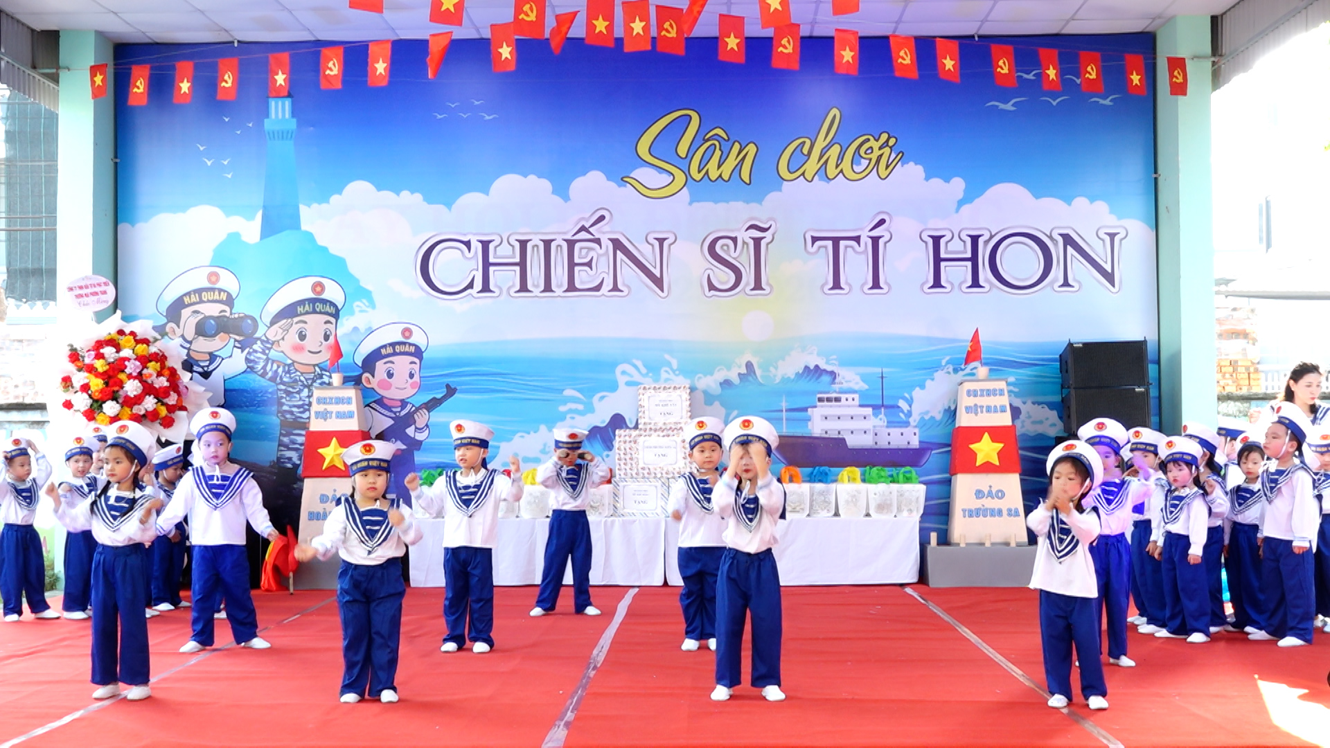 Ở phần thi “Lời chào chiến sĩ”, các trung đội đã có những màn chào hỏi ngắn gọn, ngộ nghĩnh, sáng tạo thông qua lời giới thiệu, khẩu hiệu, động tác đội hình đội ngũ đơn giản. Mỗi lời chào thể hiện sự tự tin, mạnh dạn của trẻ, đồng thời giới thiệu hình ảnh người lính với niềm tự hào, hồn nhiên đúng với lứa tuổi mầm non. Tiếp đến, là phần thi “Chiến sĩ vui khoẻ”, các bé tham gia các màn đồng diễn tập thể trên nền nhạc với chủ đề ca ngợi quê hương, đất nước, biển đảo và hình ảnh chú bộ đội. Những động tác vận động nhịp nhàng, khỏe khoắn không chỉ giúp trẻ rèn luyện thể chất mà còn tạo không khí sôi nổi, vui tươi, góp phần phát triển kỹ năng phối hợp, tinh thần tập thể và sự tự tin. Với phần thi “Chiến sĩ giỏi”, các bé được tham gia những trò chơi vận động kết hợp kỹ năng khéo léo như: cắm cây, luồn cán cờ, đi thuyền trồng cây, cắm cờ lên đảo Hoàng Sa – Trường Sa. Các phần thi được tổ chức sinh động, phù hợp với lứa tuổi, lồng ghép nội dung hướng về biển đảo quê hương. Qua đó, giúp trẻ tiếp cận những khái niệm đầu tiên về chủ quyền Tổ quốc một cách nhẹ nhàng, gần gũi.