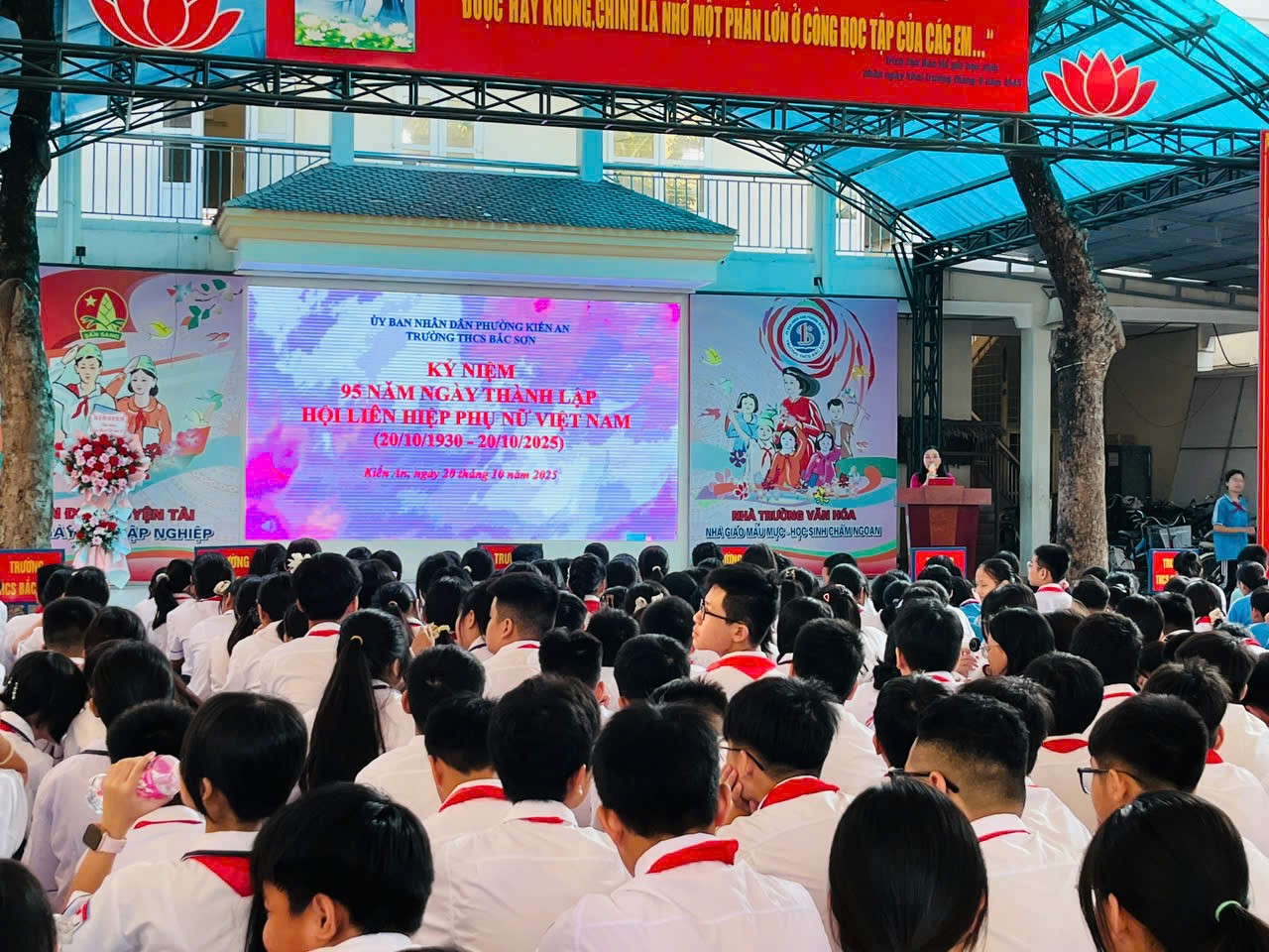 Sáng ngày 20/10/2025, trong không khí trang trọng, ấm áp và đầy ý nghĩa, Trường THCS Bắc Sơn tổ chức chương trình kỷ niệm 95 năm Ngày thành lập Hội Liên hiệp Phụ nữ Việt Nam (20/10/1930 – 20/10/2025). Tới dự có đại diện lãnh đạo các tổ chức chính trị - xã hội phường; đại diện Phòng Văn hoá – xã hội phường, Tiểu đoàn Chỉ huy pháo binh 33 – đơn vị kết nghĩa với nhà trường. Tham dự chương trình có Ban Giám hiệu nhà trường, Ban đại diện cha mẹ học sinh, giáo viên, nhân viên cùng đông đảo các em học sinh.
