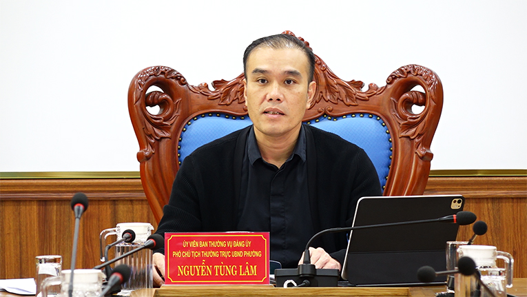 Đồng chí Nguyễn Tùng Lâm - Ủy viên Ban Thường vụ Đảng ủy, Phó Chủ tịch Ủy ban nhân dân phường, Chủ tịch Hội đồng bồi thường hỗ trợ và tái định cư chủ trì buổi làm việc.